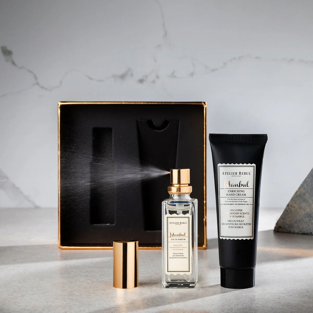 Add to wishlistAtelier Rebul Istanbul Miniature Kit EDP + Handcream €34,00 Add to cartLogin for wishlistPay directFree shipping From €75,-DescriptionThis miniature kit is the perfect gift for yourself or a loved one. The set includes a 12ml Istanbul Eau de Parfum — the ideal size to carry in your handbag wherever you go — and a hydrating hand cream with the same delightful scent.