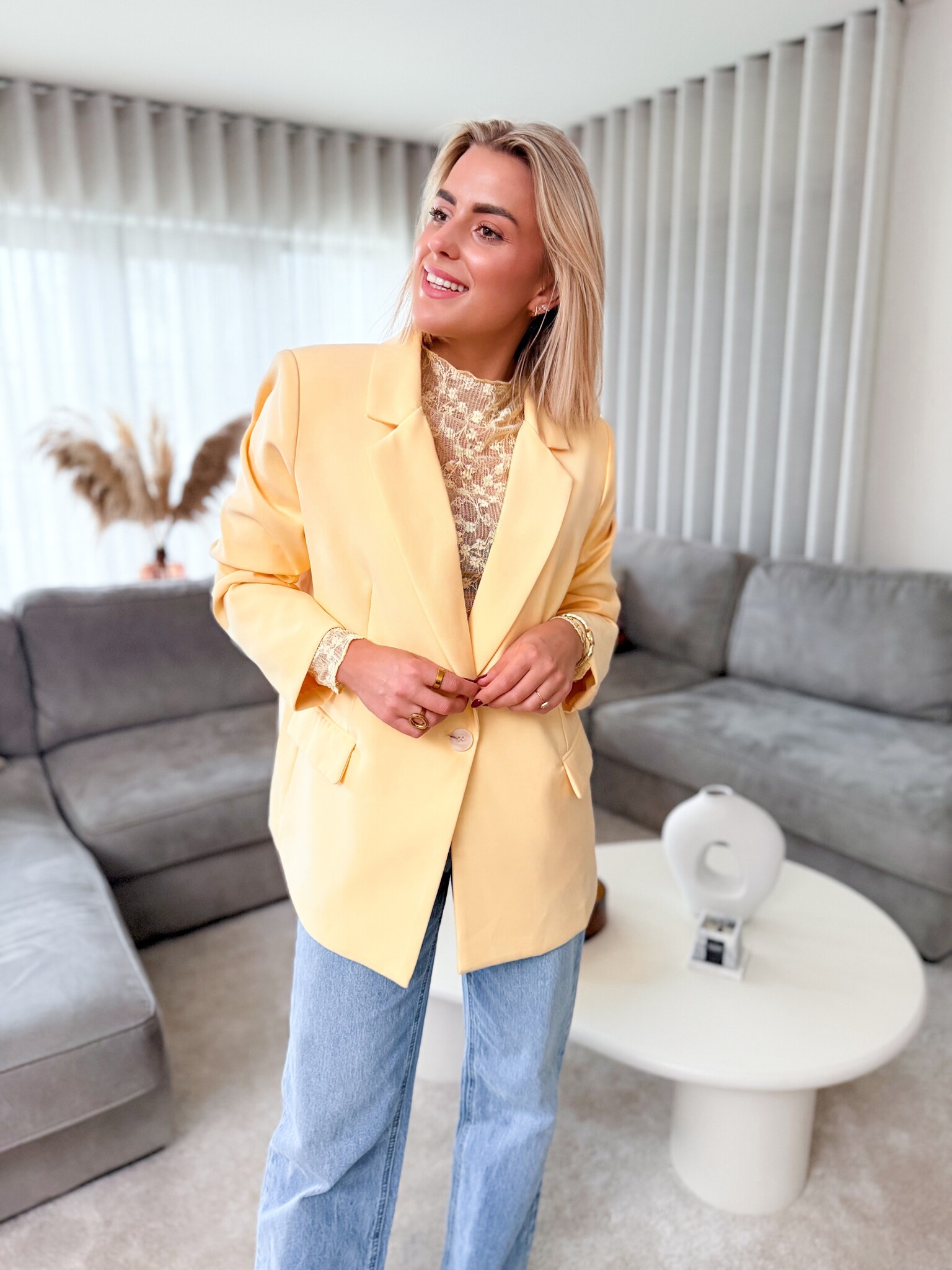 Add to wishlistBlush & butter blazer pastel yellow €74,99 Size: *SMLXLAdd to cartLogin for wishlistPay directDescriptionYellow blazer, a true eye-catcher. Adds color and cheer to your look and to those around you. A must-have piece to step into sunny days in style. True to size.