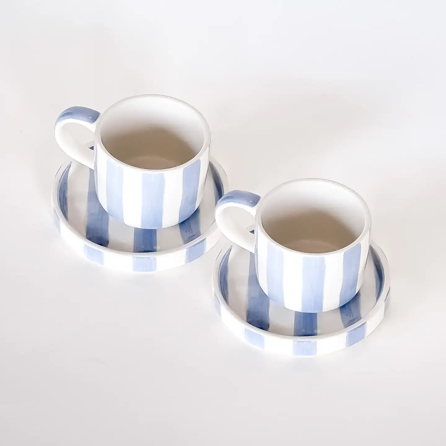 Add to wishlistEspresso 2-piece set + plates Azure Blue €39,99 Add to cartLogin for wishlistPay directFree shipping From €75,-DescriptionSet consisting of 4 pieces (2 cups and 2 saucers), each pair forming a cup with saucer (4 pieces total). Perfect for enjoying an Italian espresso for two. Made of high-quality ceramic and uniquely hand-painted. Dishwasher and microwave safe.