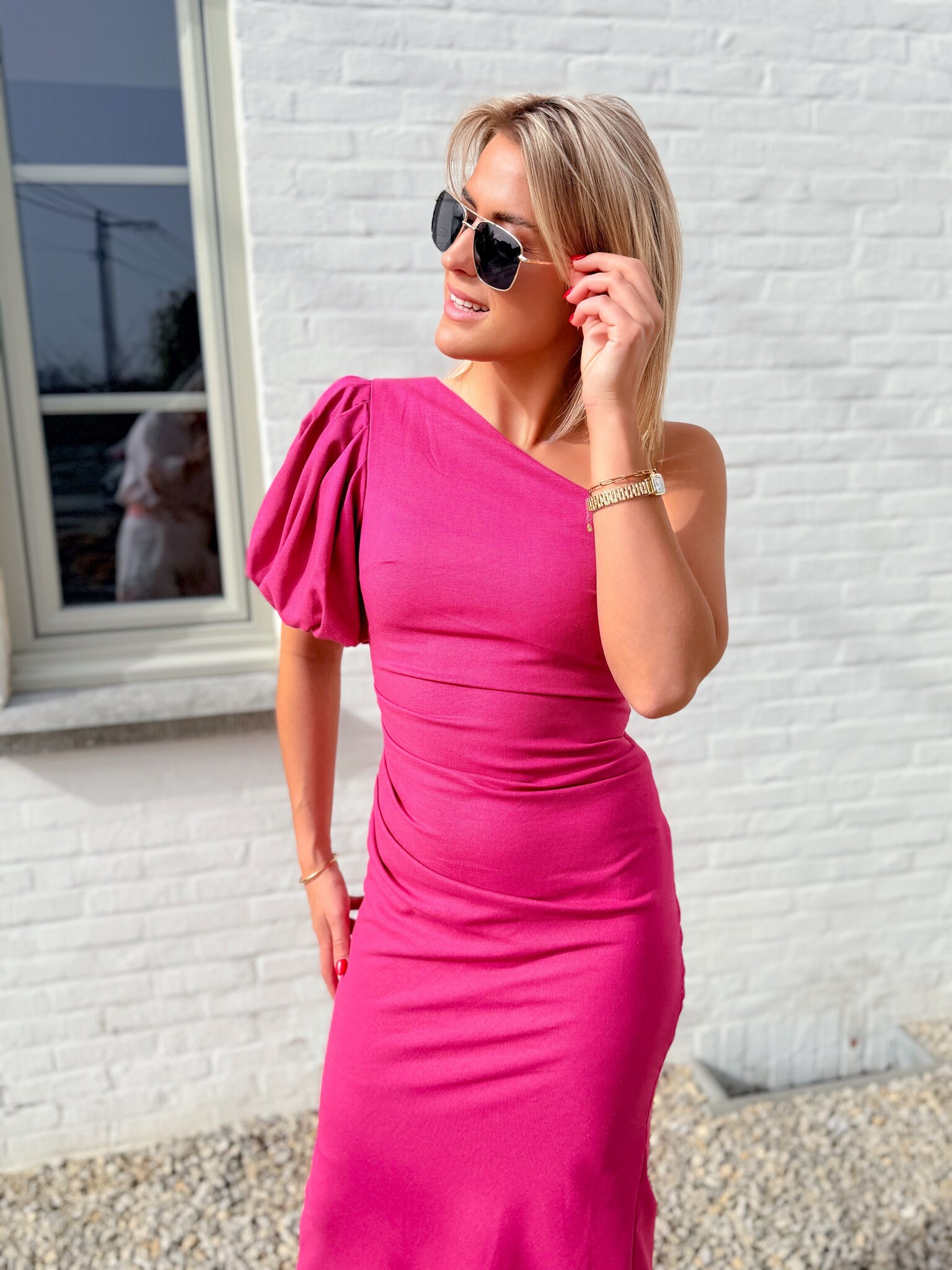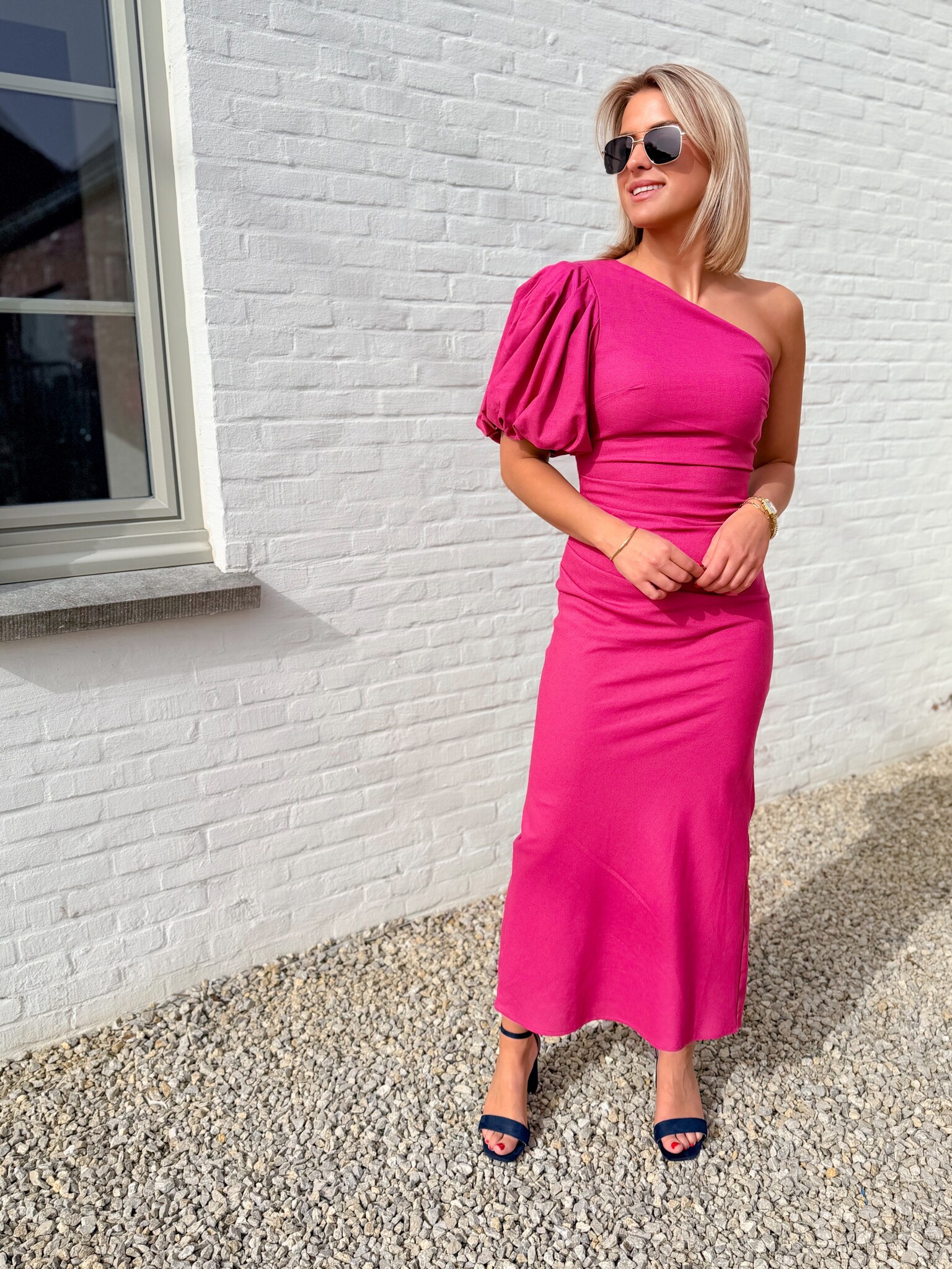 Add to wishlistPower drape dress framboos €44,99 Size: *SMLAdd to cartLogin for wishlistPay directDescriptionATTENTION: RUNS SMALL, WE RECOMMEND ORDERING ONE SIZE UP. Cotton dress with a linen-look fabric that doesn’t wrinkle. Features one off-shoulder sleeve and one puff sleeve, a fitted silhouette with a back slit. Perfect for vacations or special occasions