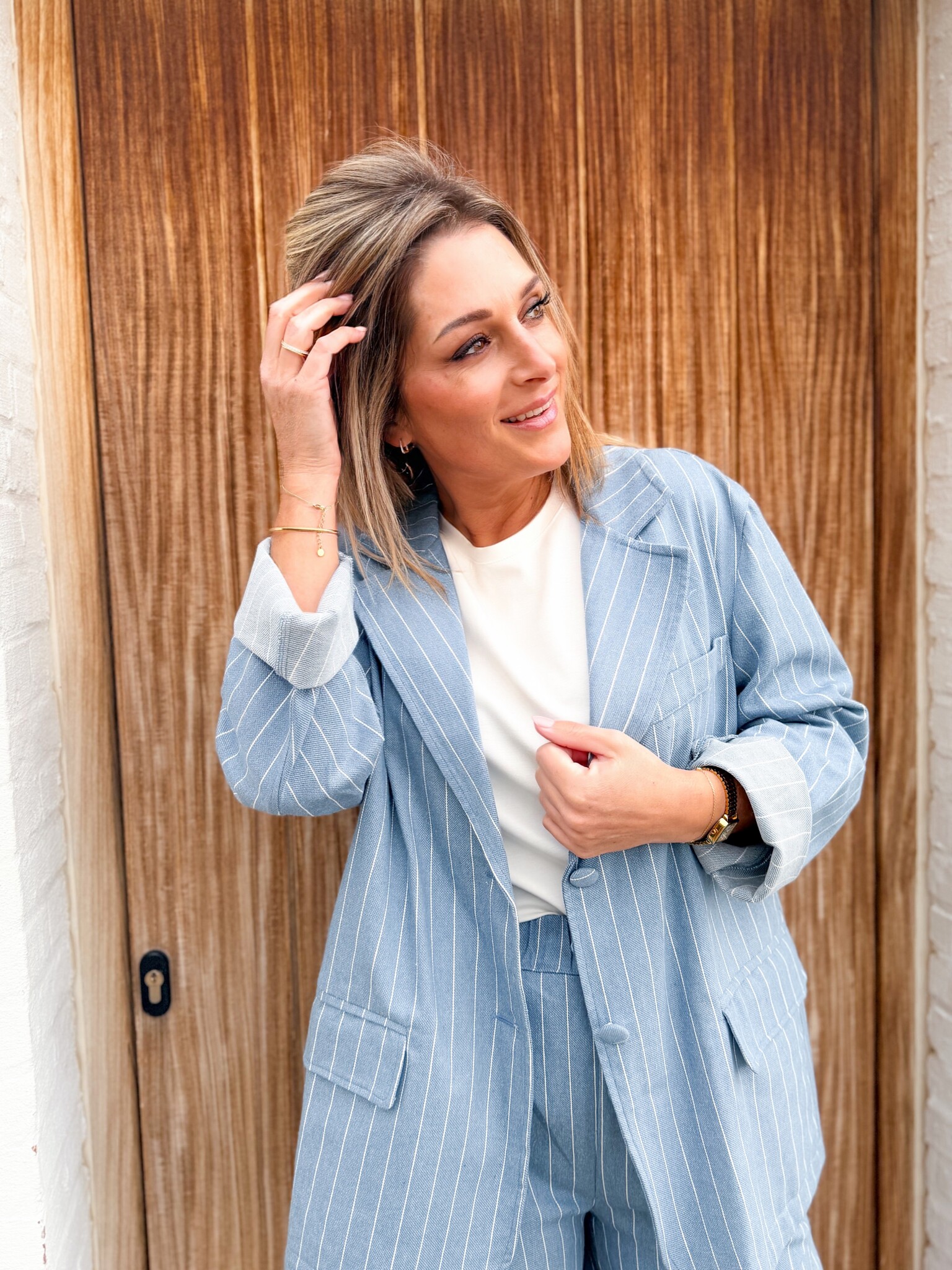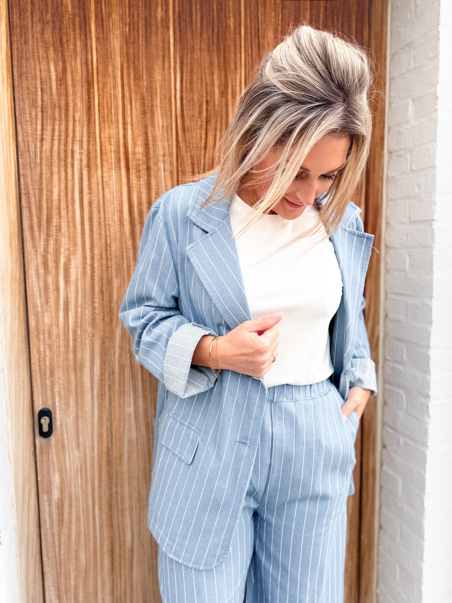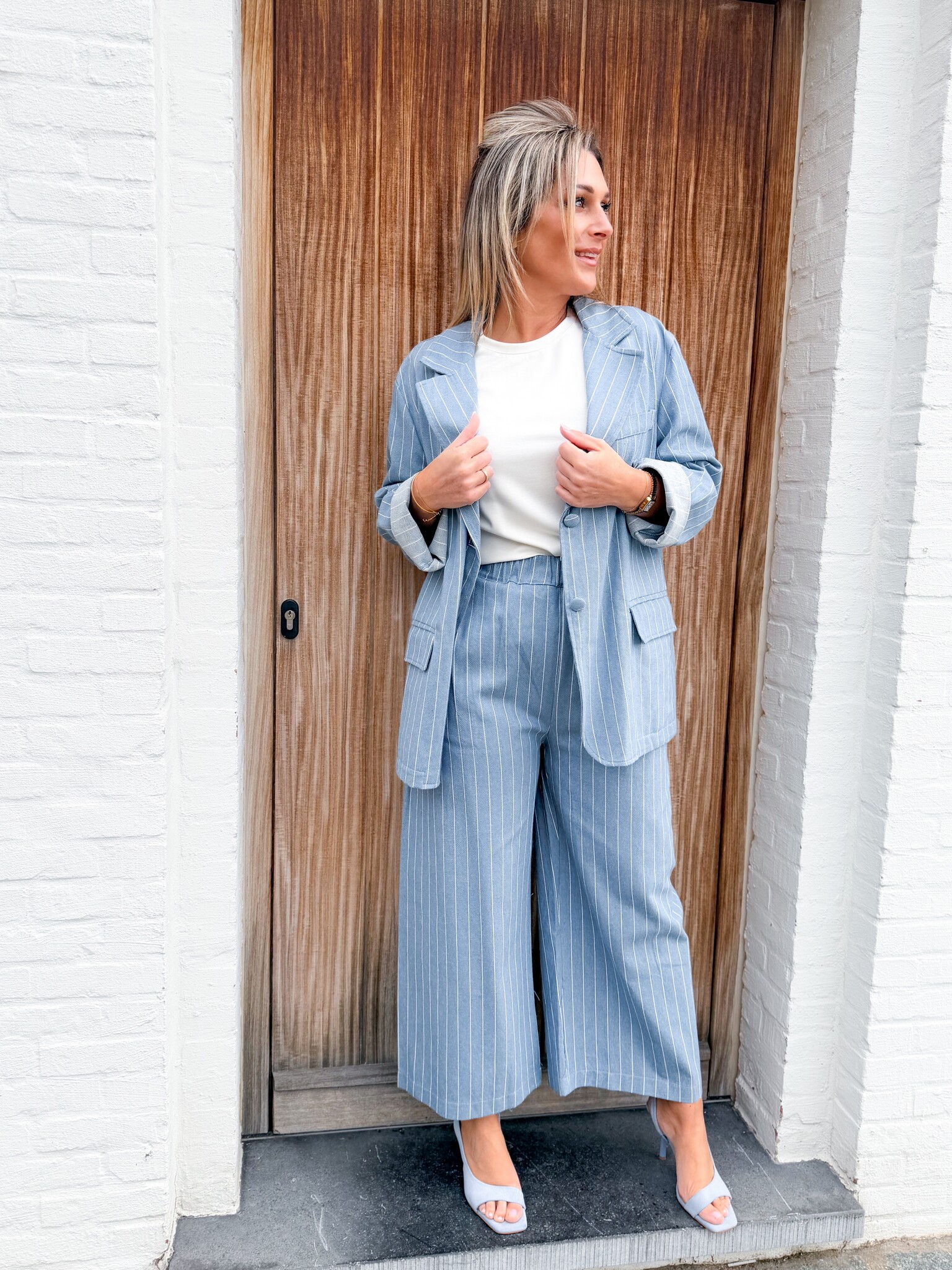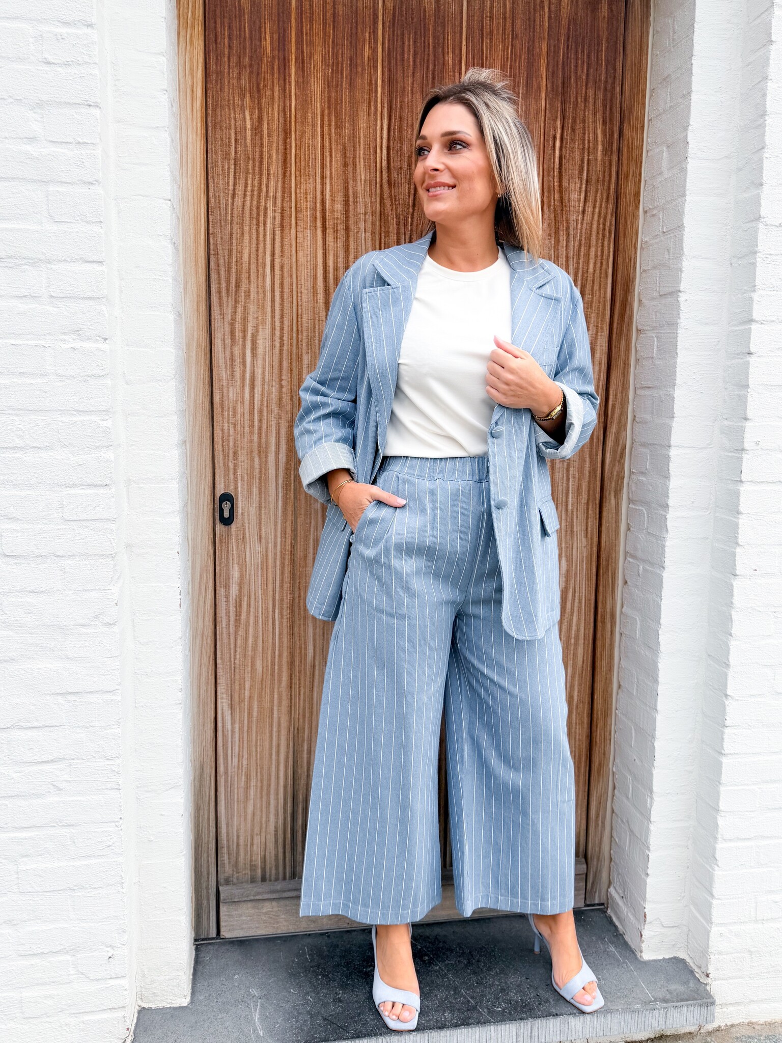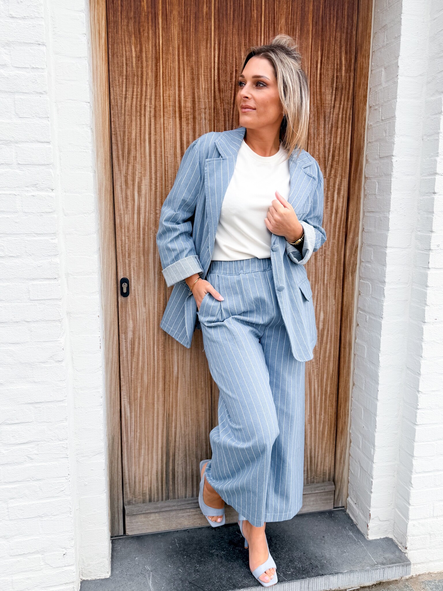 Add to wishlistRegatta pants blue €59,99 Add to cartLogin for wishlistPay directFree shipping From €75,-DescriptionStriped cotton trousers with an elastic waistband, fits sizes S to L. Comfortable and stylish, perfect to pair with the matching oversized blazer. Model is 1.62 m.