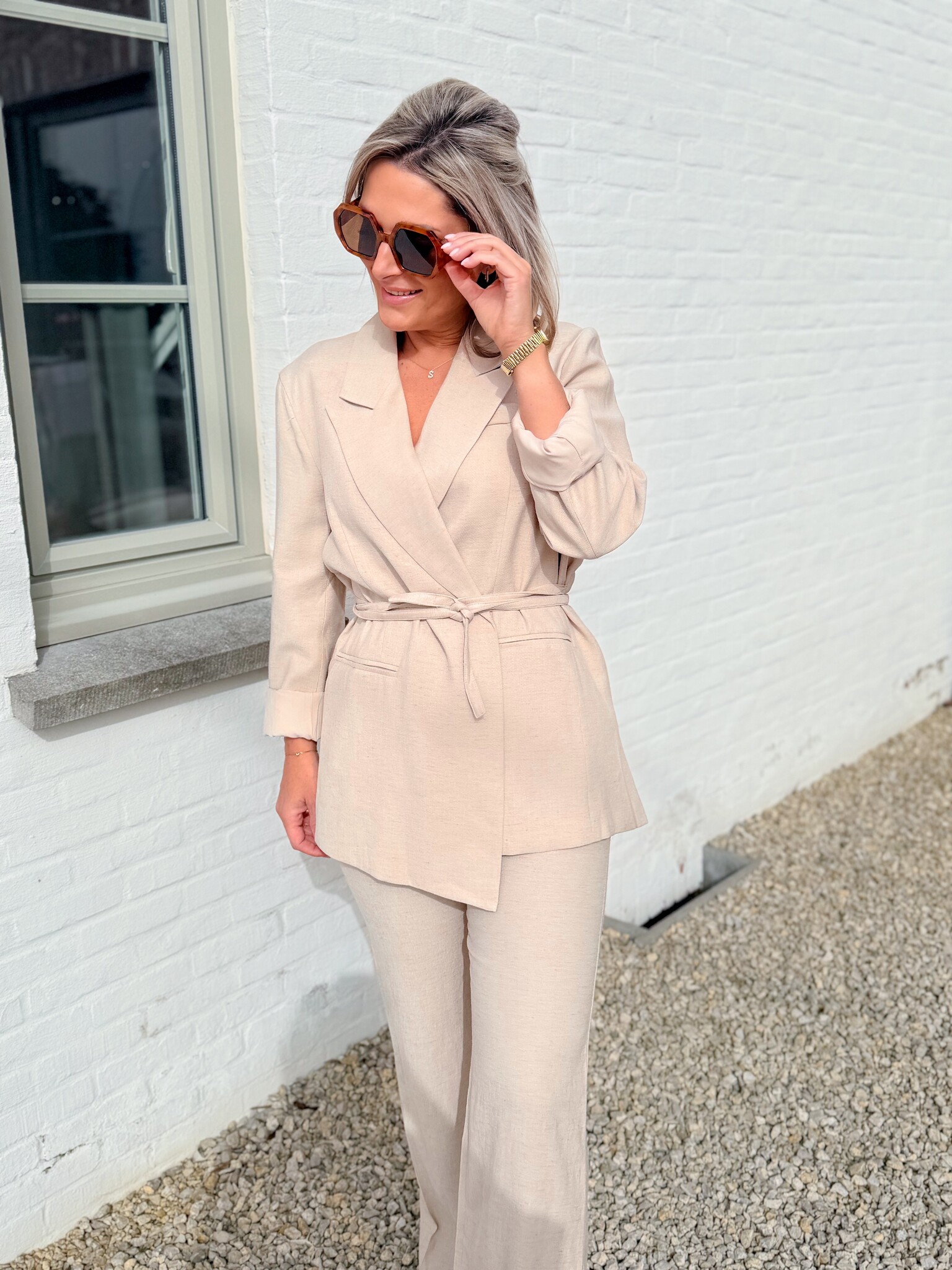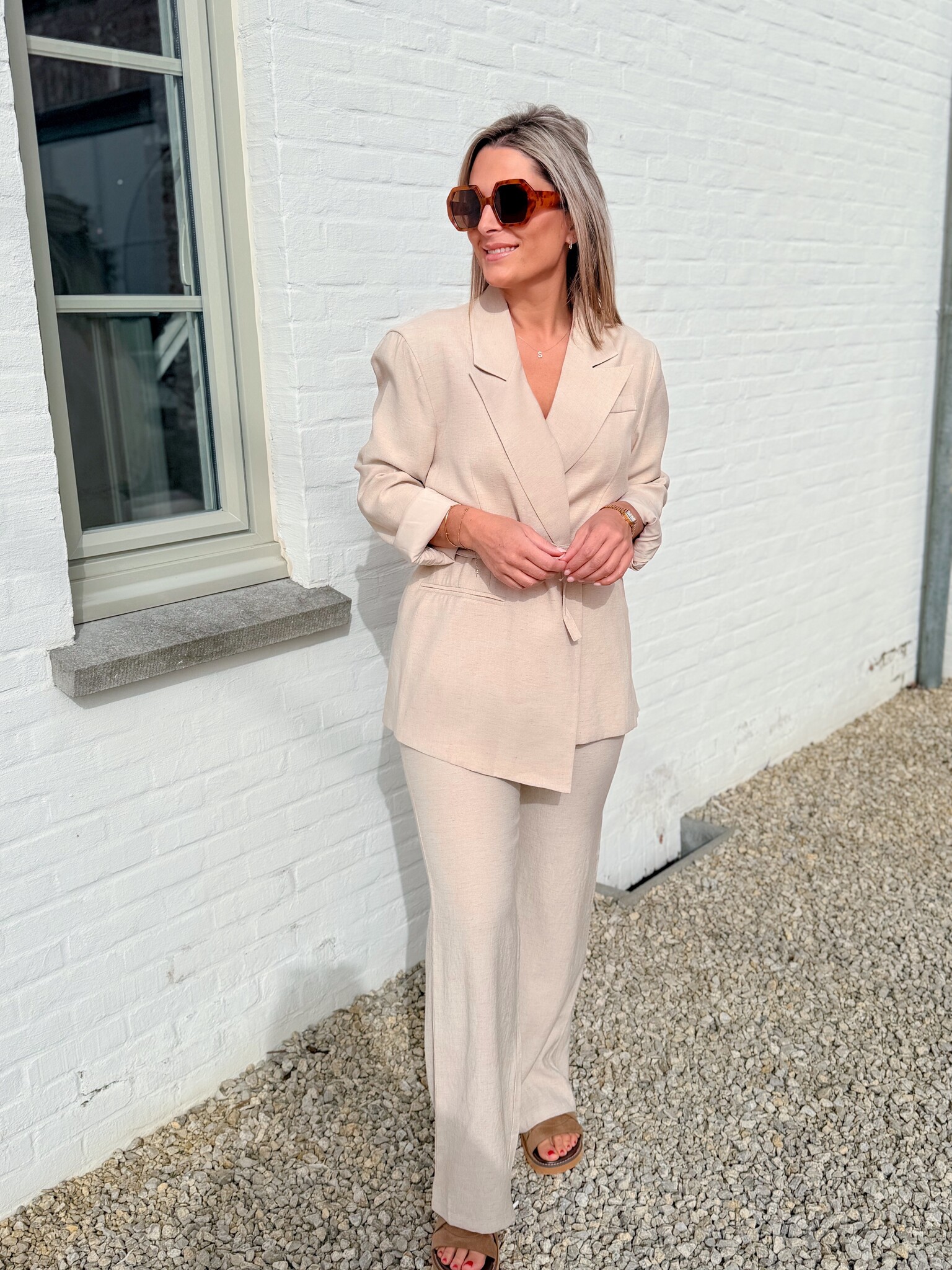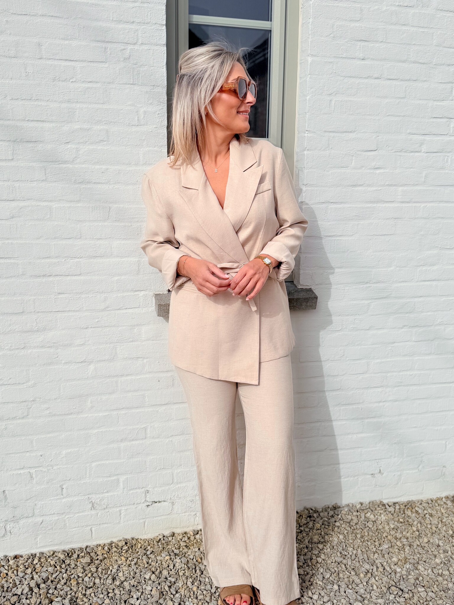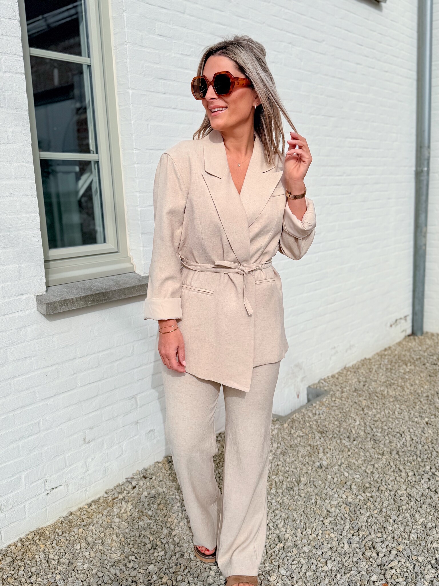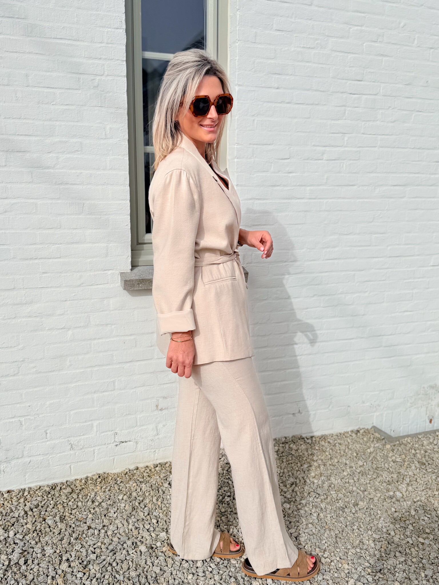 Add to wishlistThe classic linnenlook set beige €84,99 Size: *SMLAdd to cartLogin for wishlistPay directDescriptionRUNS SMALL! We recommend choosing one size up; if you have slightly wider hips, go for two sizes up. This lovely linen set with an elegant blazer gives you a chic and comfortable look.