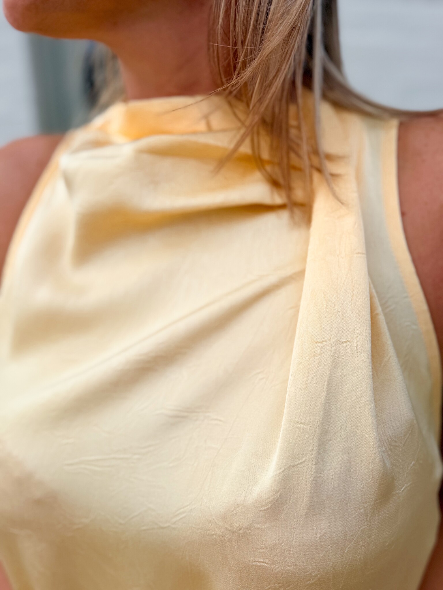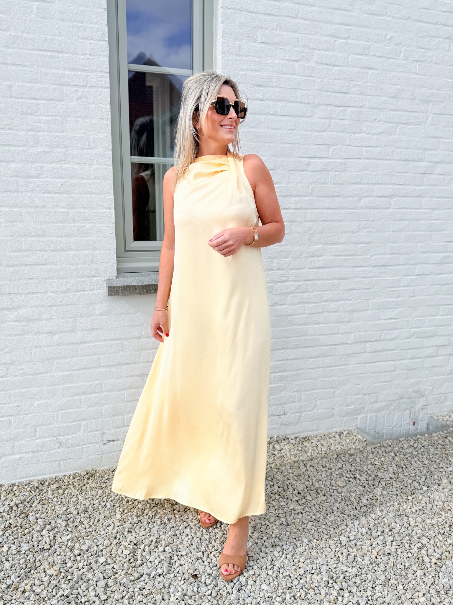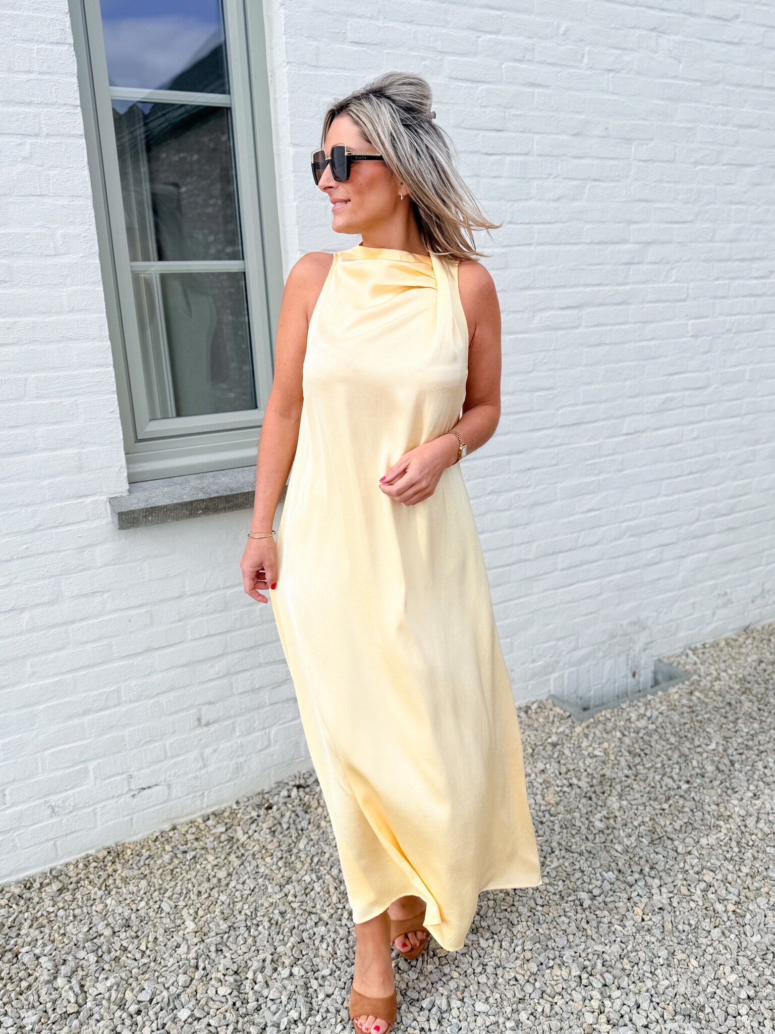 Add to wishlistVenice long dress €49,99 Size: *SMLLogin for wishlistDescriptionLong yellow satin-look dress with an elegant detail at the top. Flows gracefully along the body for a stylish, feminine look. True to size. Model is 1.62 m tall and wears size S.