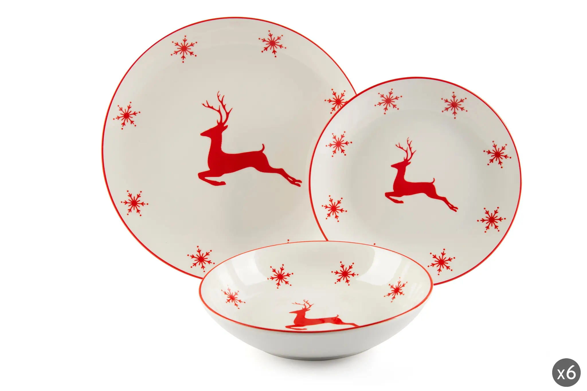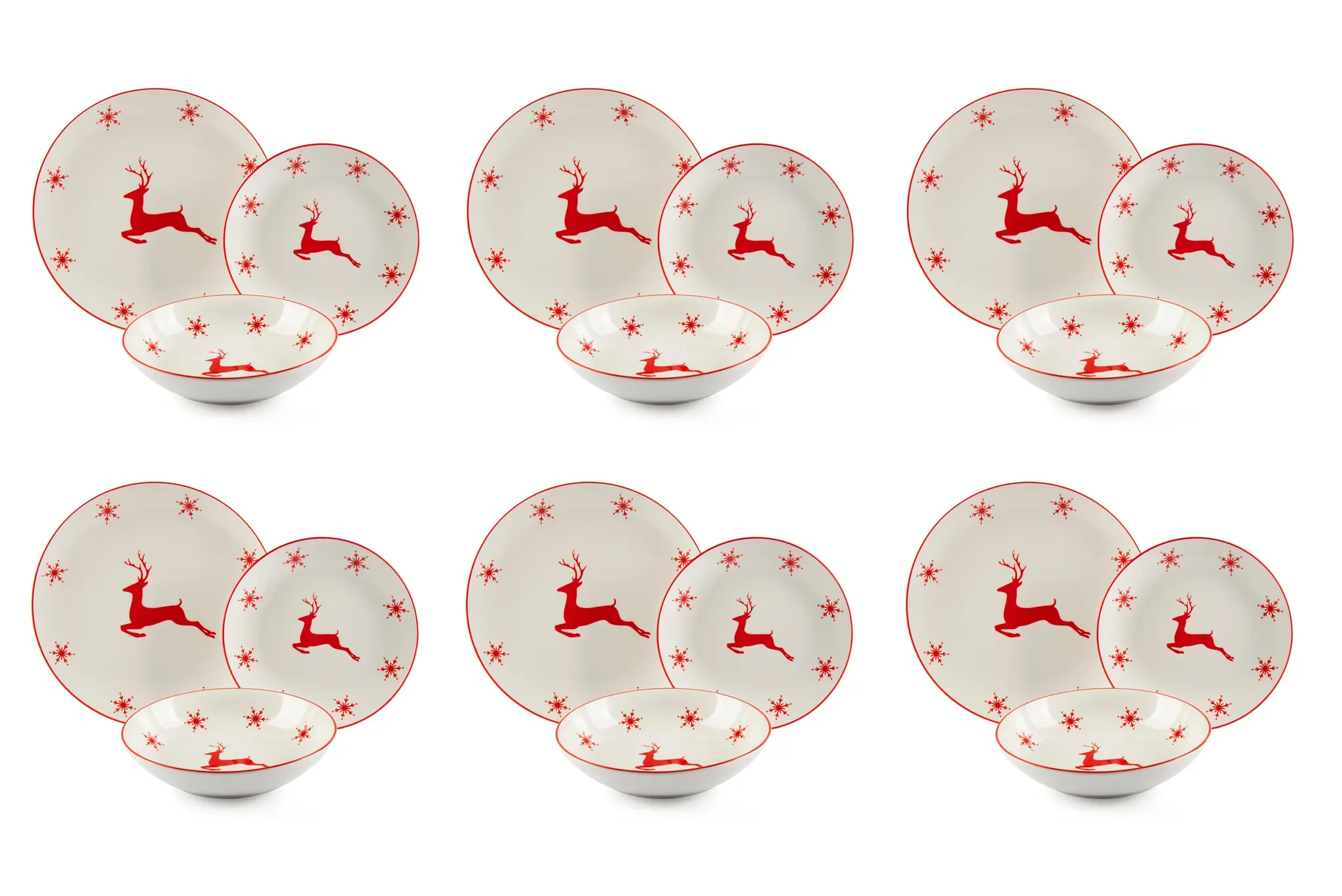 Deze bordenset van porselein met rendier en sneeuwkristallen design omvat 6 platte borden, 6 diepe borden en 6 dessert borden voor de ultieme Kerstliefhebbers! De duurzame set is vaatwasmachine- en magnetronbestendig en geschikt voor dagelijks gebruik.