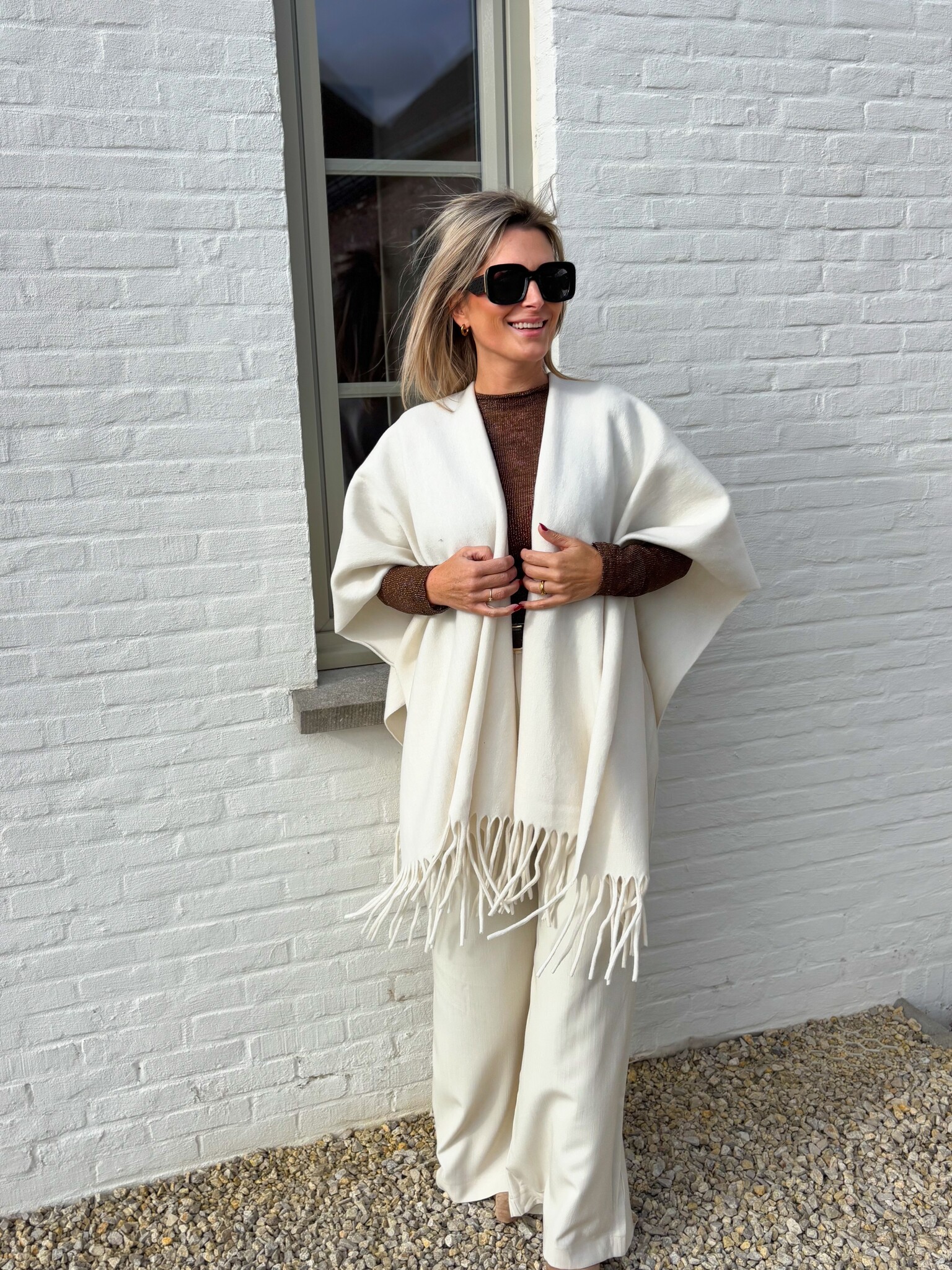 Cozy en elegante cape die je op twee manieren kunt dragen: los over de schouders voor een klassieke look of als sjaal over één schouder voor een stijlvolle, ontspannen uitstraling.