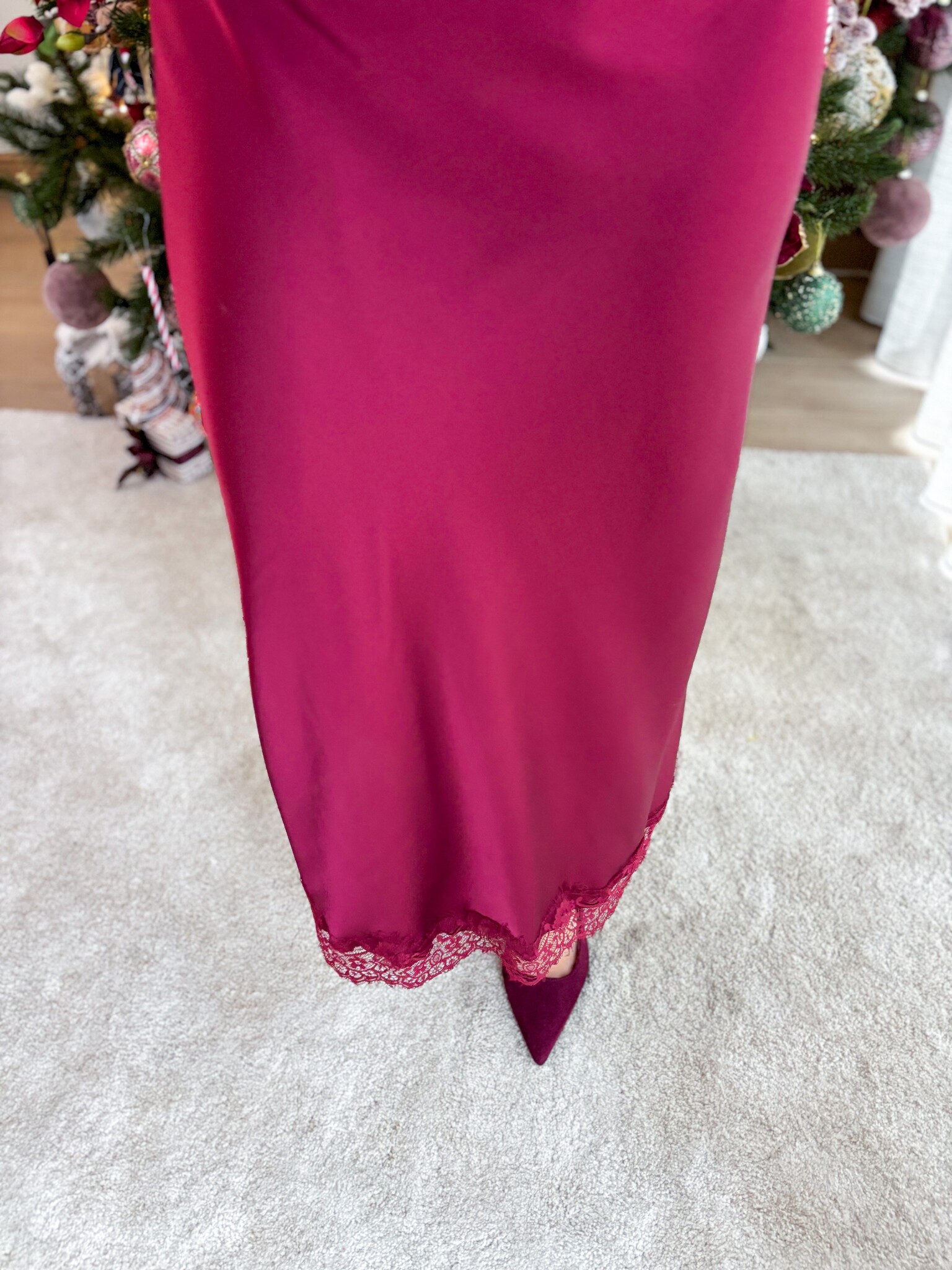 Aan verlanglijst toevoegenCéleste skirt wine red €34,99 Size: *SMLToevoegen aan winkelwagenInloggen voor wishlistDirect betalenGratis verzending Vanaf €75,-BeschrijvingSatin look midi-rok met elegante lace afwerking onderaan. Valt normaal van maat en creëert een vrouwelijke, verfijnde look. Model is 1,62 m.