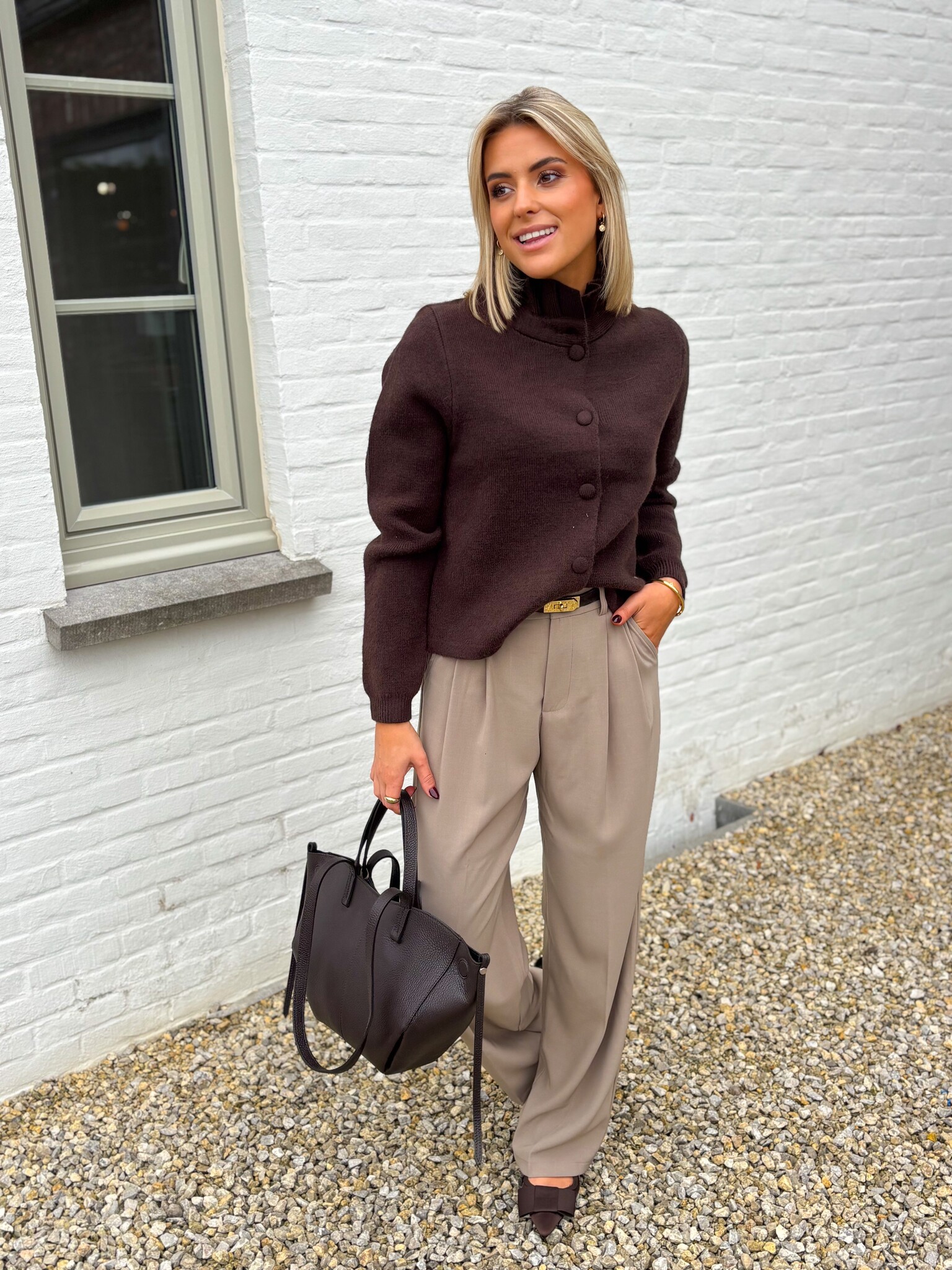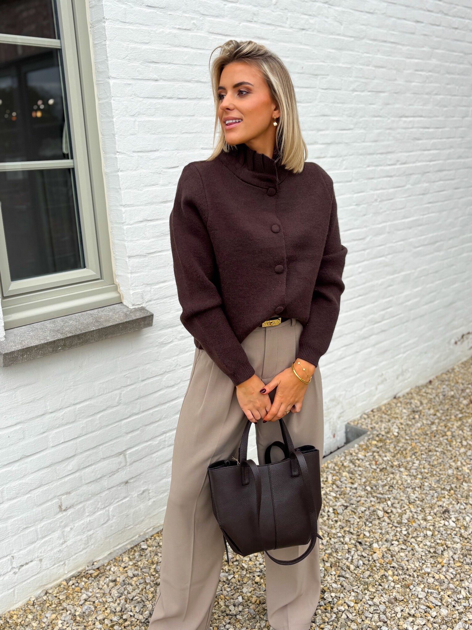 Prachtig pulletje met knoopjes en een mooi kraagje met ruches voor een elegante touch. One size, past goed tot maat L. Model is 1.62 m. Combineer met een rok of jeans voor een vrouwelijke en stijlvolle look, perfect voor zowel casual als dressy momenten.