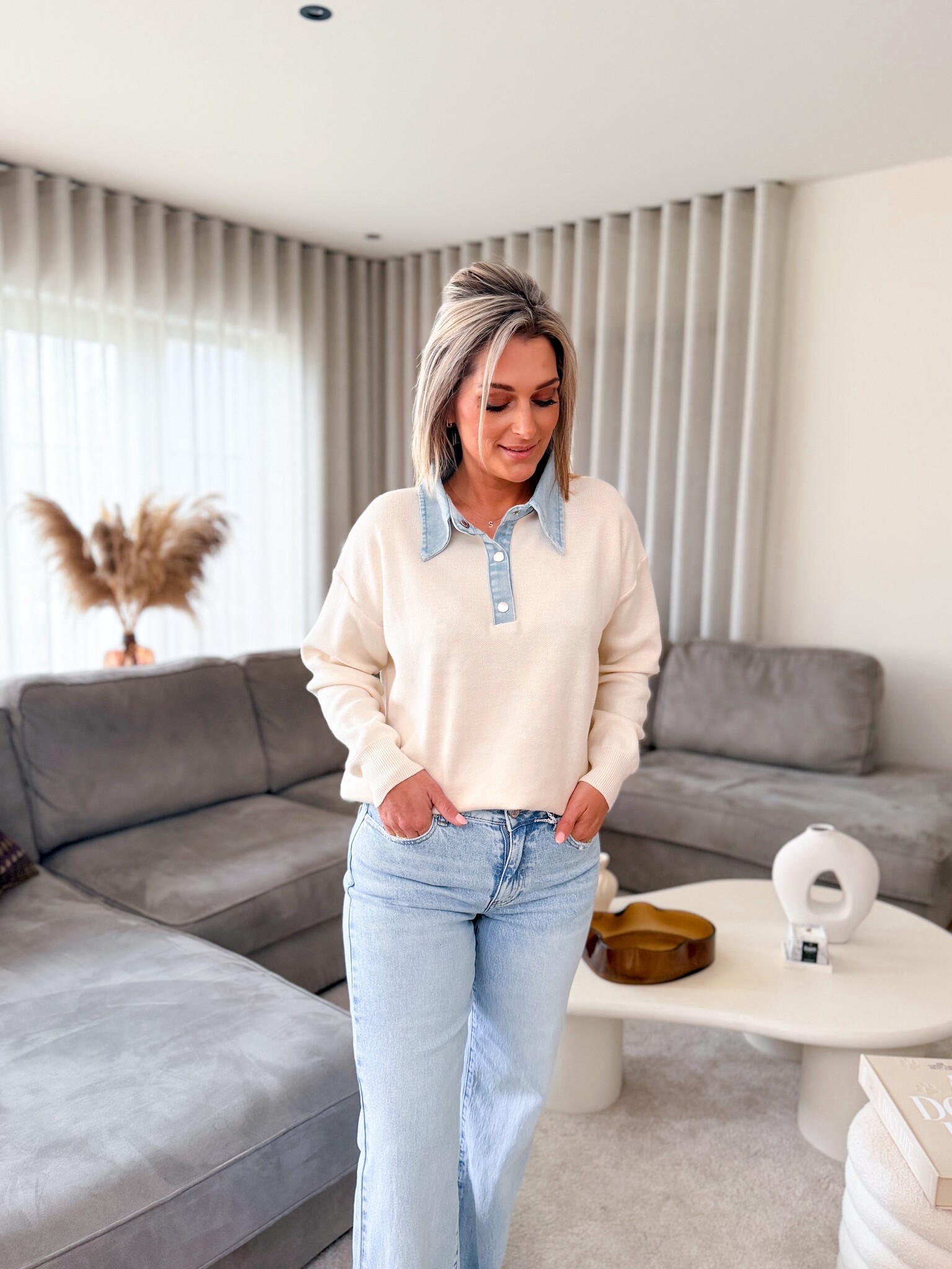 Aan verlanglijst toevoegenDenim kiss pull €49,99 Toevoegen aan winkelwagenInloggen voor wishlistDirect betalenGratis verzending Vanaf €75,-BeschrijvingZachte trui met een stoere denimkraag, die een casual en moderne touch aan je outfit geeft. Perfect om eenvoudig een relaxte maar stijlvolle look te creëren. Past goed tot laat L.