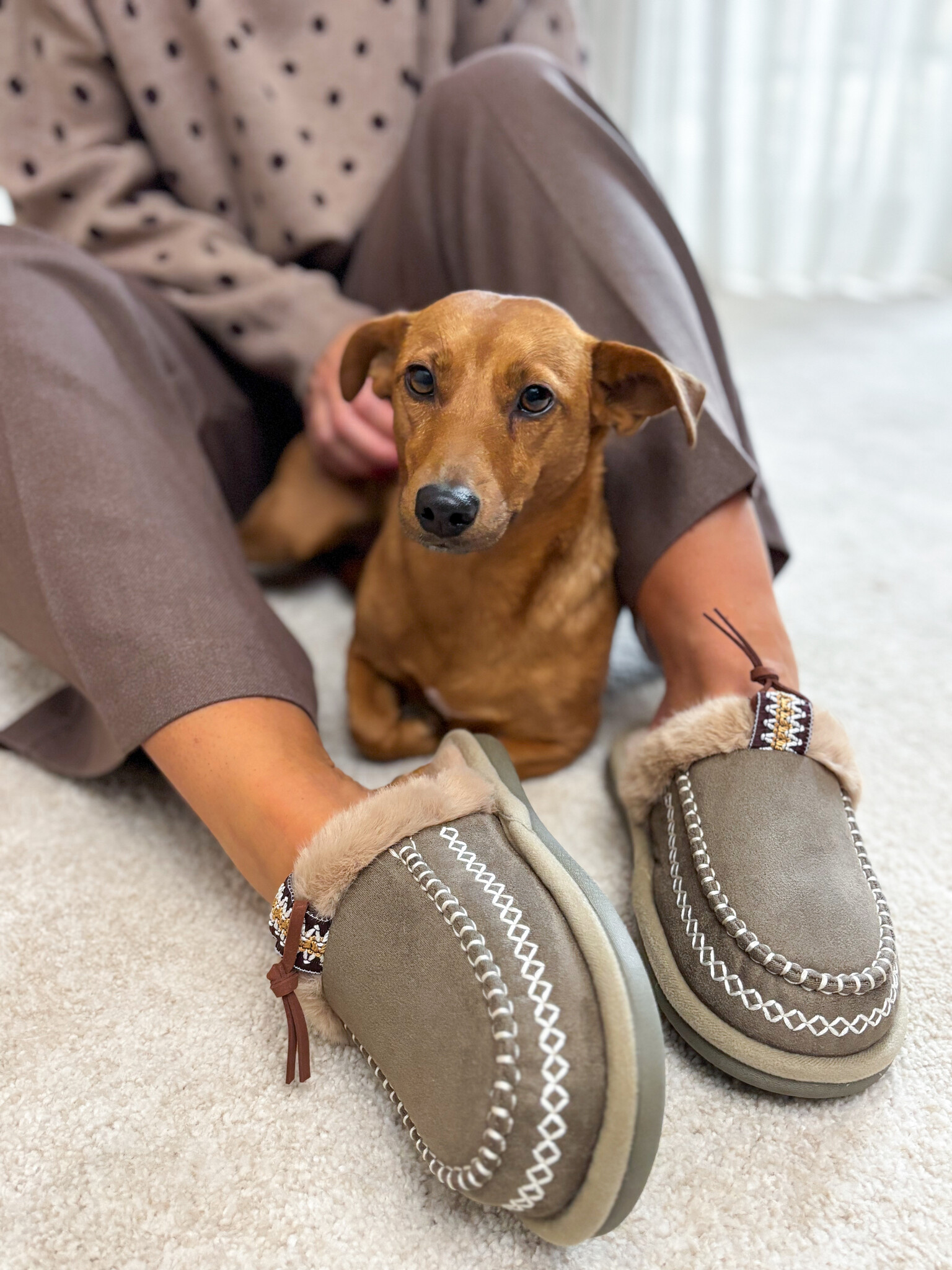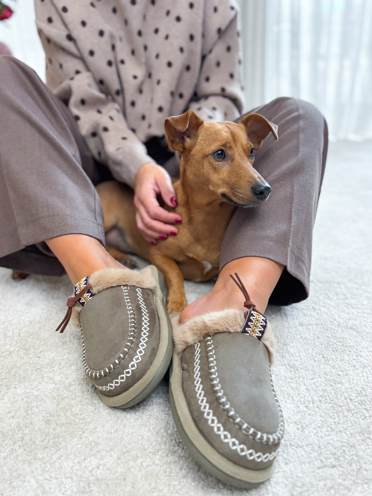 Aan verlanglijst toevoegenEskimo teddy slippers €19,99 Size: *363738394041Toevoegen aan winkelwagenInloggen voor wishlistDirect betalenGratis verzending Vanaf €75,-BeschrijvingKnusse, warme pantoffels met een zachte voering en decoratief stiksel. Perfect om thuis heerlijk in weg te kruipen. De neutrale kleur en het subtiele patroon geven ze een stijlvolle, cozy uitstraling. Valt normaal op maat.