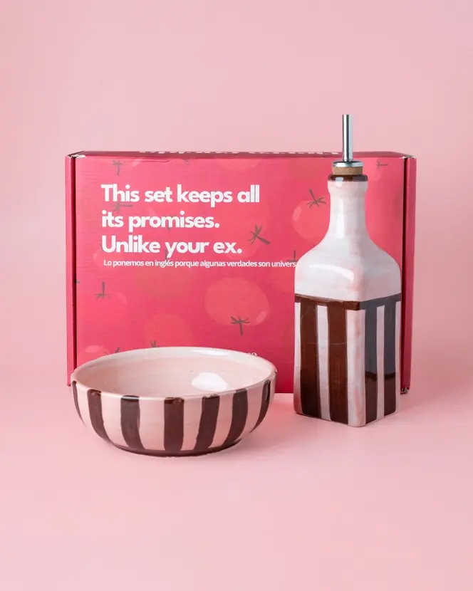 Deze set van een raspbord (voor het raspen van onder andere tomaten)16cm doorsnede en een oliefles van 375ml is het perfecte cadeau voor de fijnproever of designbewuste kok! Deze roze met bruine ontbijtset is handgemaakt, vaatwas en magnetronbestendig.