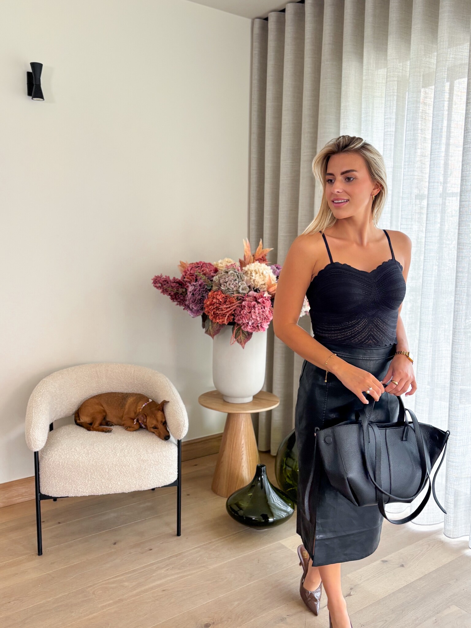 Aan verlanglijst toevoegenLeonor bag Black €110,00 Toevoegen aan winkelwagenInloggen voor wishlistDirect betalenGratis verzending Vanaf €75,-BeschrijvingLederen handtas met ritssluiting. Lange en korte riem.