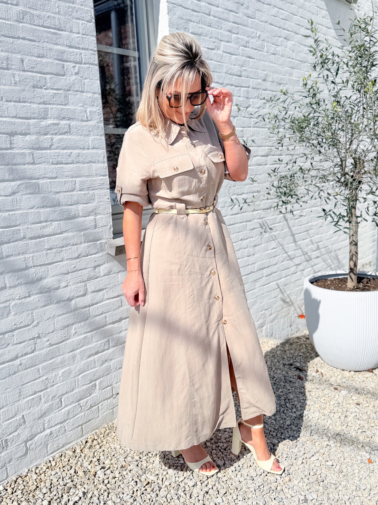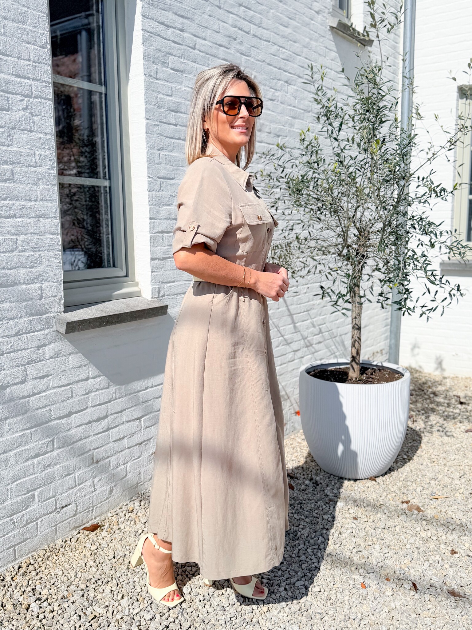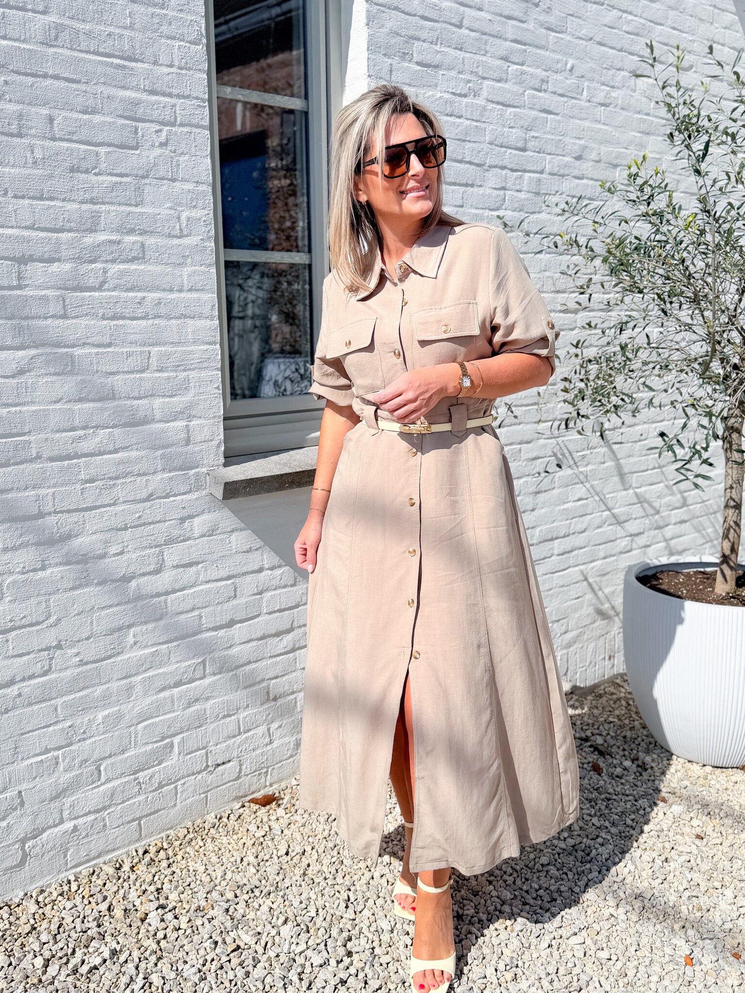 Lang kleedje in tussenkaki/beige met subtiele knoopjes. Opgerolde mouwtjes voor een casual touch, maar het geheel ziet er meteen verzorgd en elegant uit. Perfect voor dagelijks gebruik of een nette, moeiteloze look. Model is 1.62m en draagt S/M.