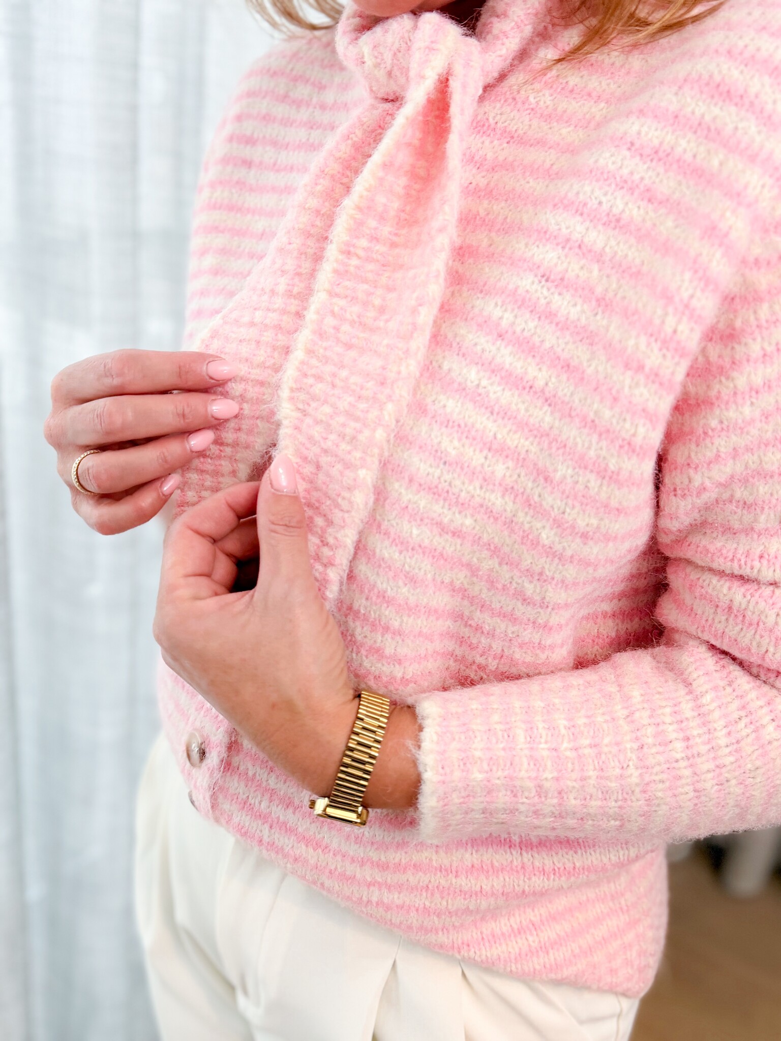 Aan verlanglijst toevoegenRosy breeze knit €44,99 Toevoegen aan winkelwagenInloggen voor wishlistDirect betalenGratis verzending Vanaf €75,-BeschrijvingZachte cardigan in wit met roze strepen, met een elegant knoopdetail aan de kraag. Valt goed tot maat L.