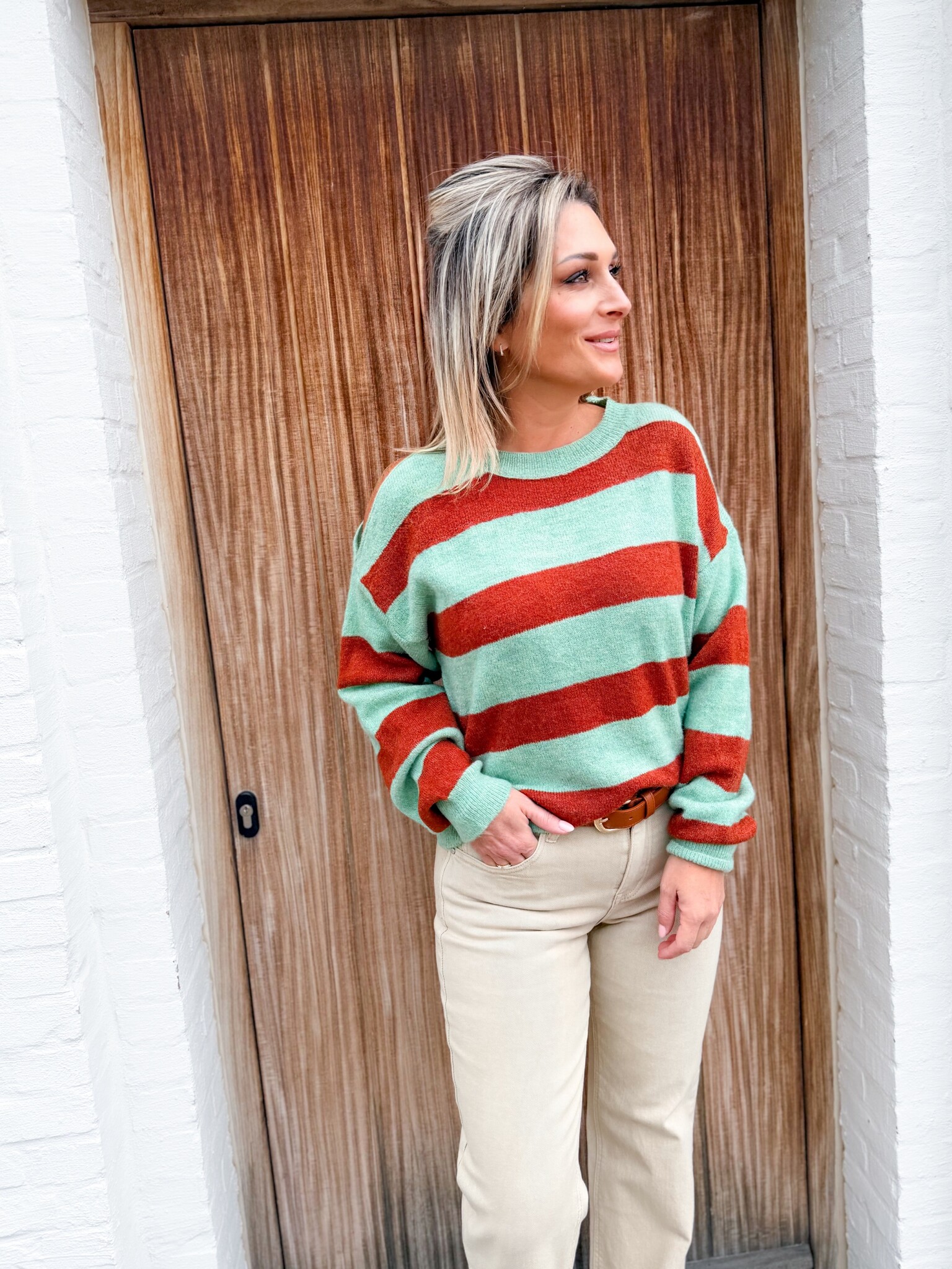 Aan verlanglijst toevoegenShoulder peek mint/rusty €49,99 Toevoegen aan winkelwagenInloggen voor wishlistDirect betalenGratis verzending Vanaf €75,-BeschrijvingMooie gestreepte trui met een subtiele opening aan één schouder, voor net dat beetje extra. Model is 1.65m en valt goed tot maat L.