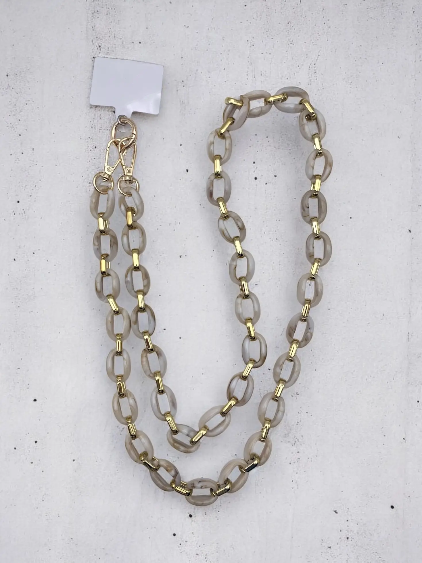 Aan verlanglijst toevoegenSmartphoneketting Beige Marble €19,99 Toevoegen aan winkelwagenInloggen voor wishlistDirect betalenGratis verzending Vanaf €75,-BeschrijvingDeze smartphoneketting is jouw nieuwe fashion bestie! Je hangt veilig je smarthone aan het kliksysteem en voegt een touch elegantie toe aan je outfit! Deze ketting heeft afwisselend beige marble en goudkleurige schakels.