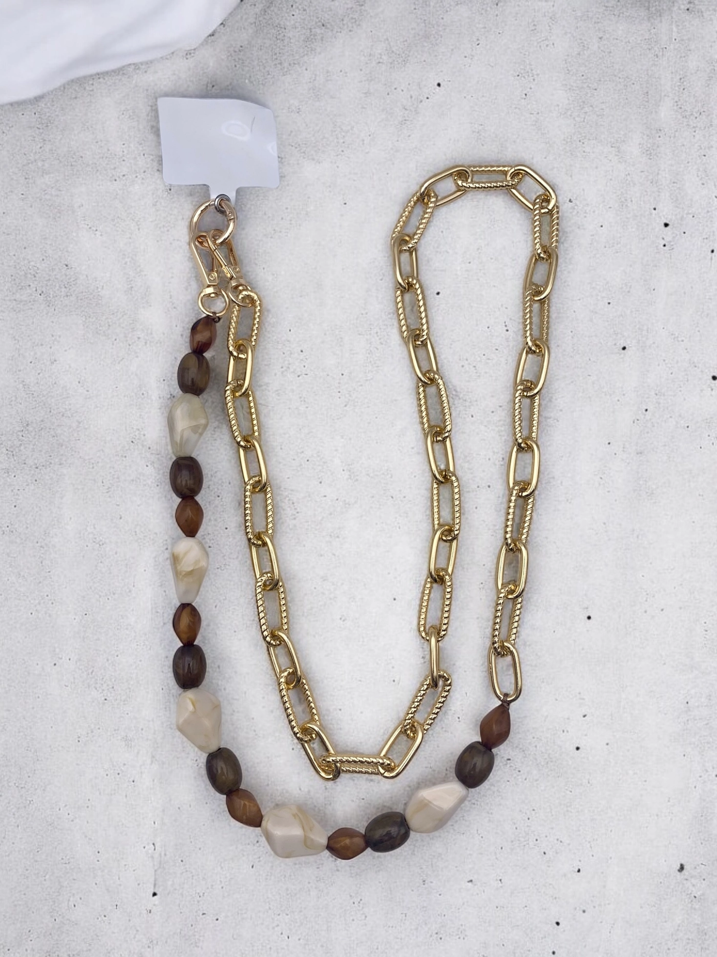 Aan verlanglijst toevoegenSmartphoneketting Kralen en Goud €19,99 Toevoegen aan winkelwagenInloggen voor wishlistDirect betalenGratis verzending Vanaf €75,-BeschrijvingDeze smartphoneketting is jouw nieuwe fashion bestie! Je hangt veilig je smarthone aan het kliksysteem en voegt een touch elegantie toe aan je outfit! Deze ketting heeft bruine en beige kralen en goudkleurige schakels.