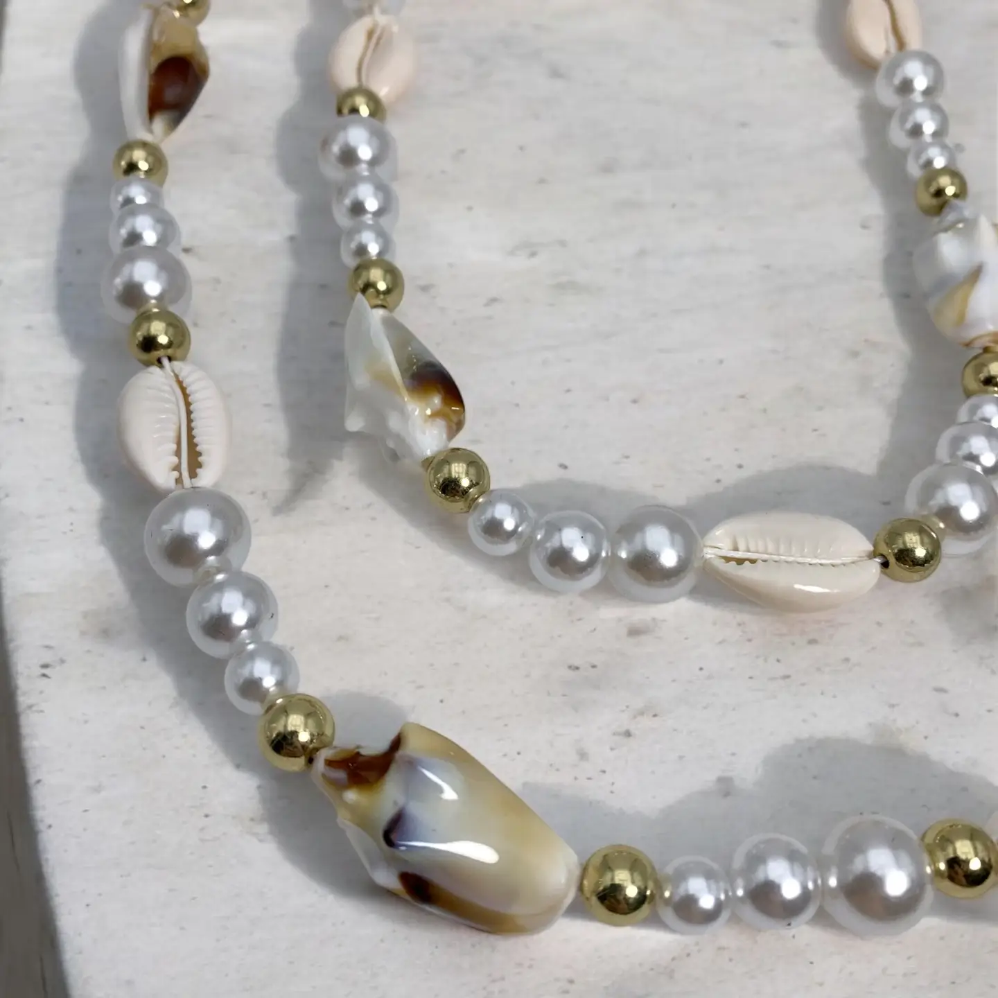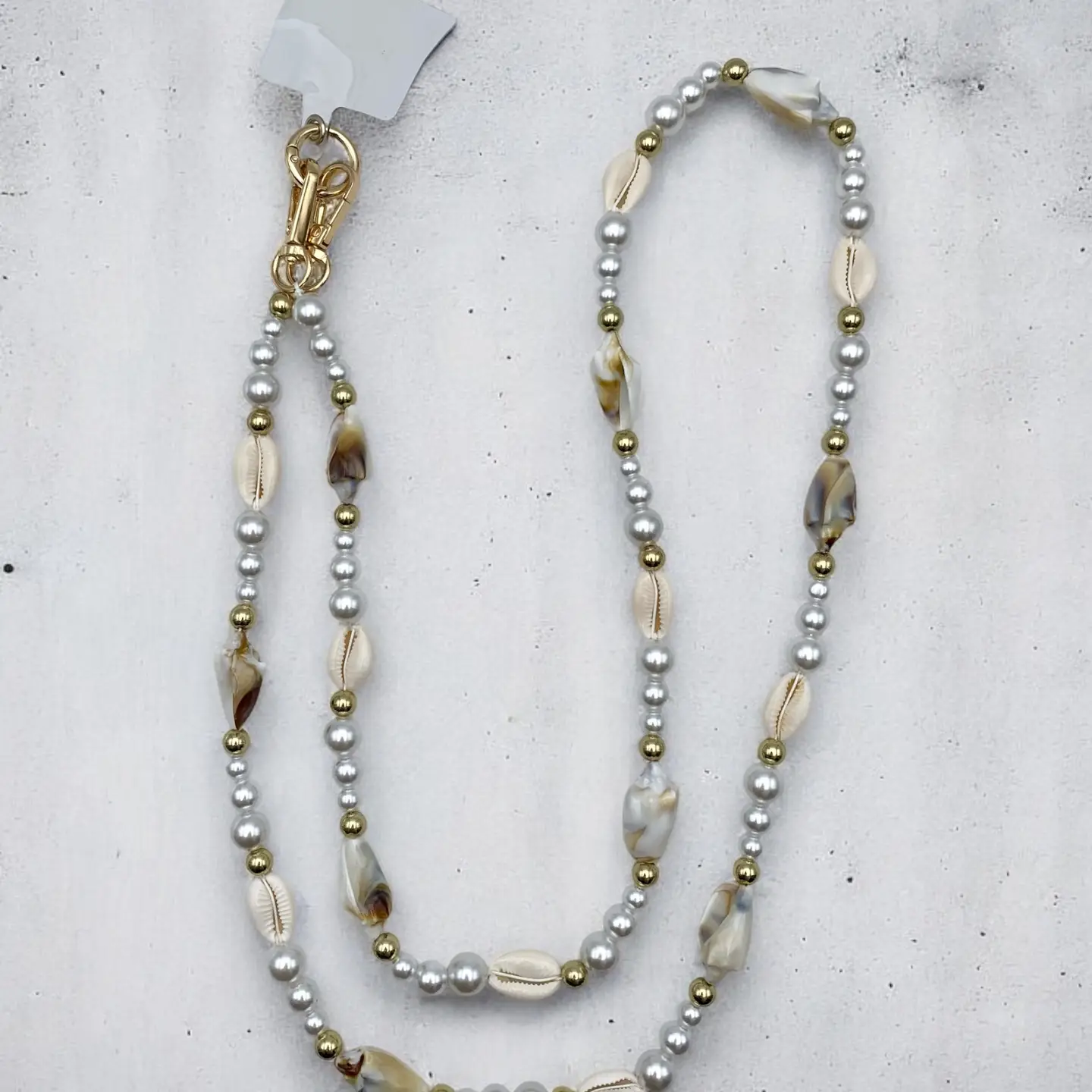 Aan verlanglijst toevoegenSmartphoneketting Shell and Pearl €19,99 Toevoegen aan winkelwagenInloggen voor wishlistDirect betalenGratis verzending Vanaf €75,-BeschrijvingDeze smartphoneketting is jouw nieuwe fashion bestie! Je hangt veilig je smarthone aan het kliksysteem en voegt een touch elegantie toe aan je outfit! Deze ketting heeft afwisselend zeeschelpen, goud- en zilverkleurige parels.
