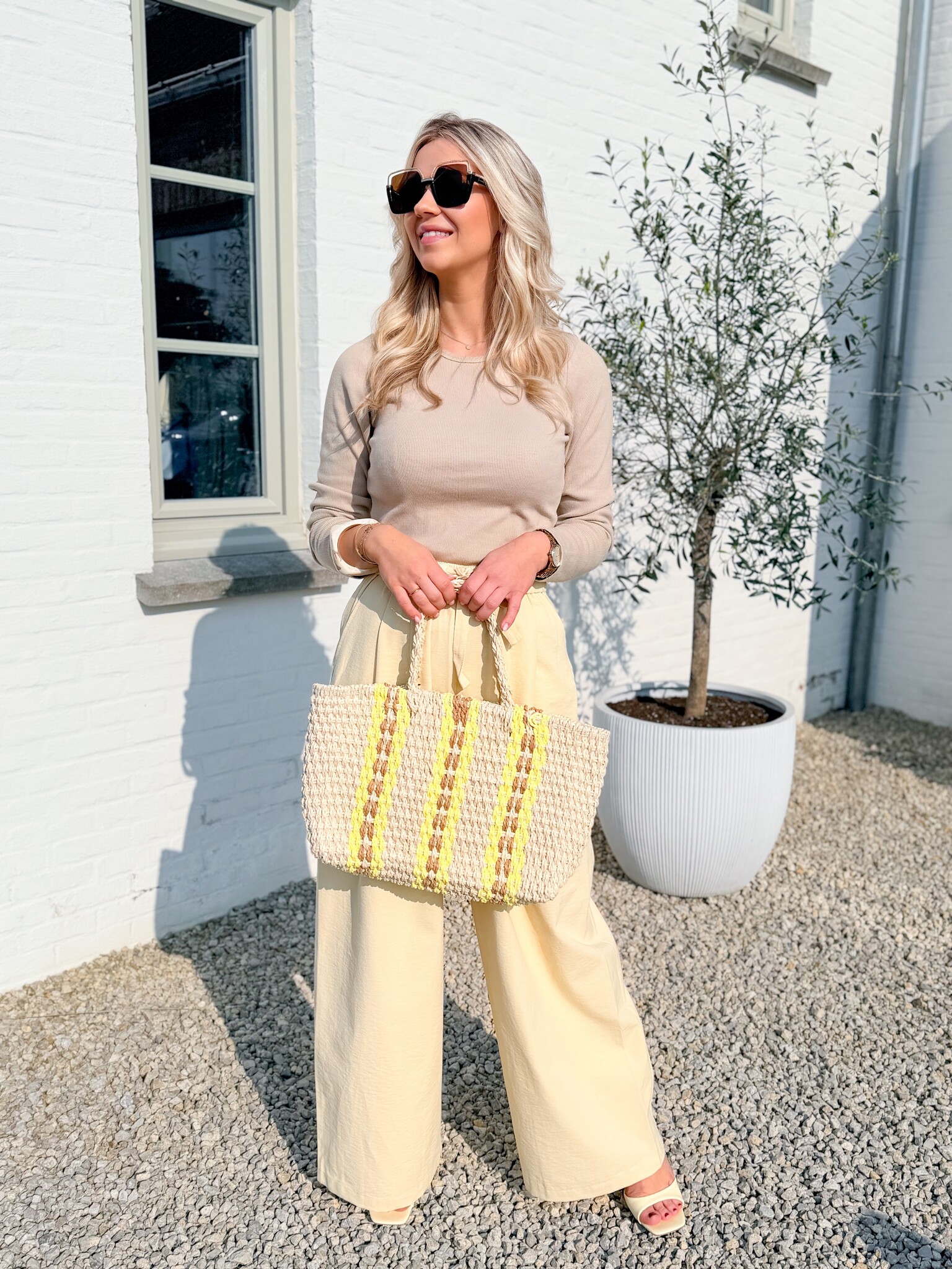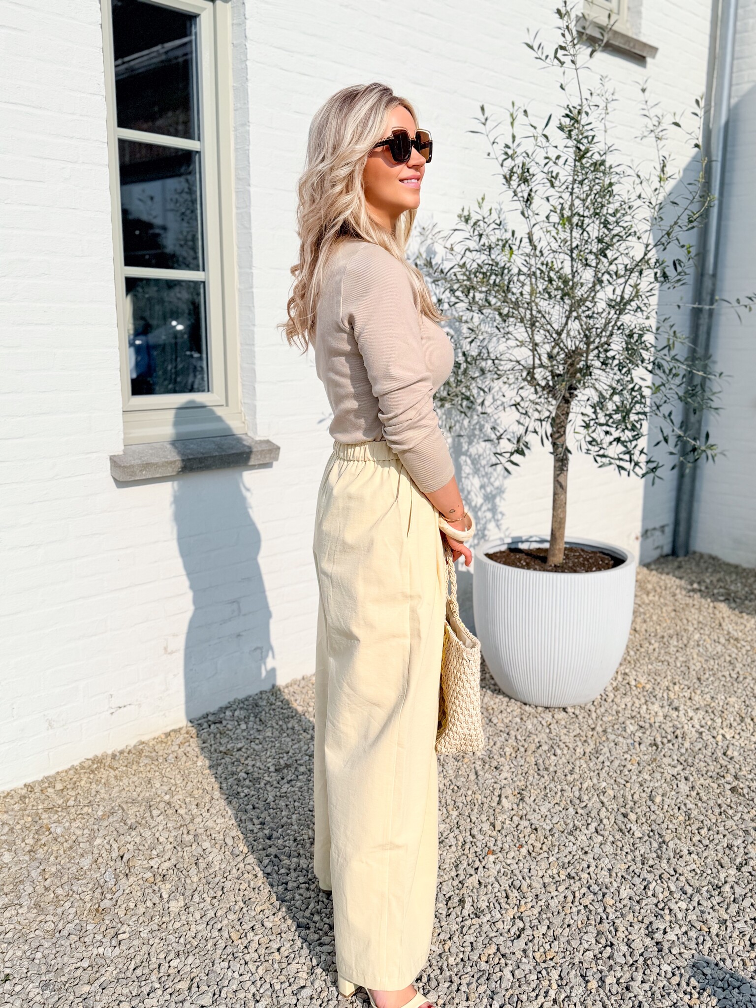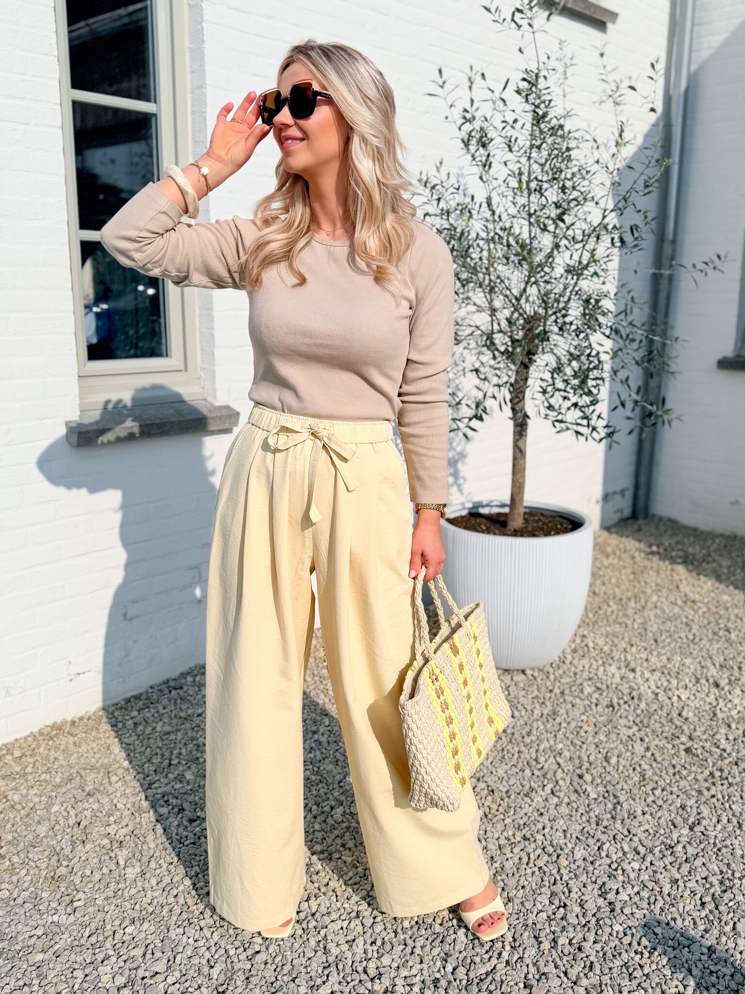 Luchtige broek met wijde pijpen en een comfortabele elastische tailleband met striklint. De soepele stof zorgt voor een elegante maar relaxte look. Perfect voor een zomerse outfit. Valt normaal van maat.