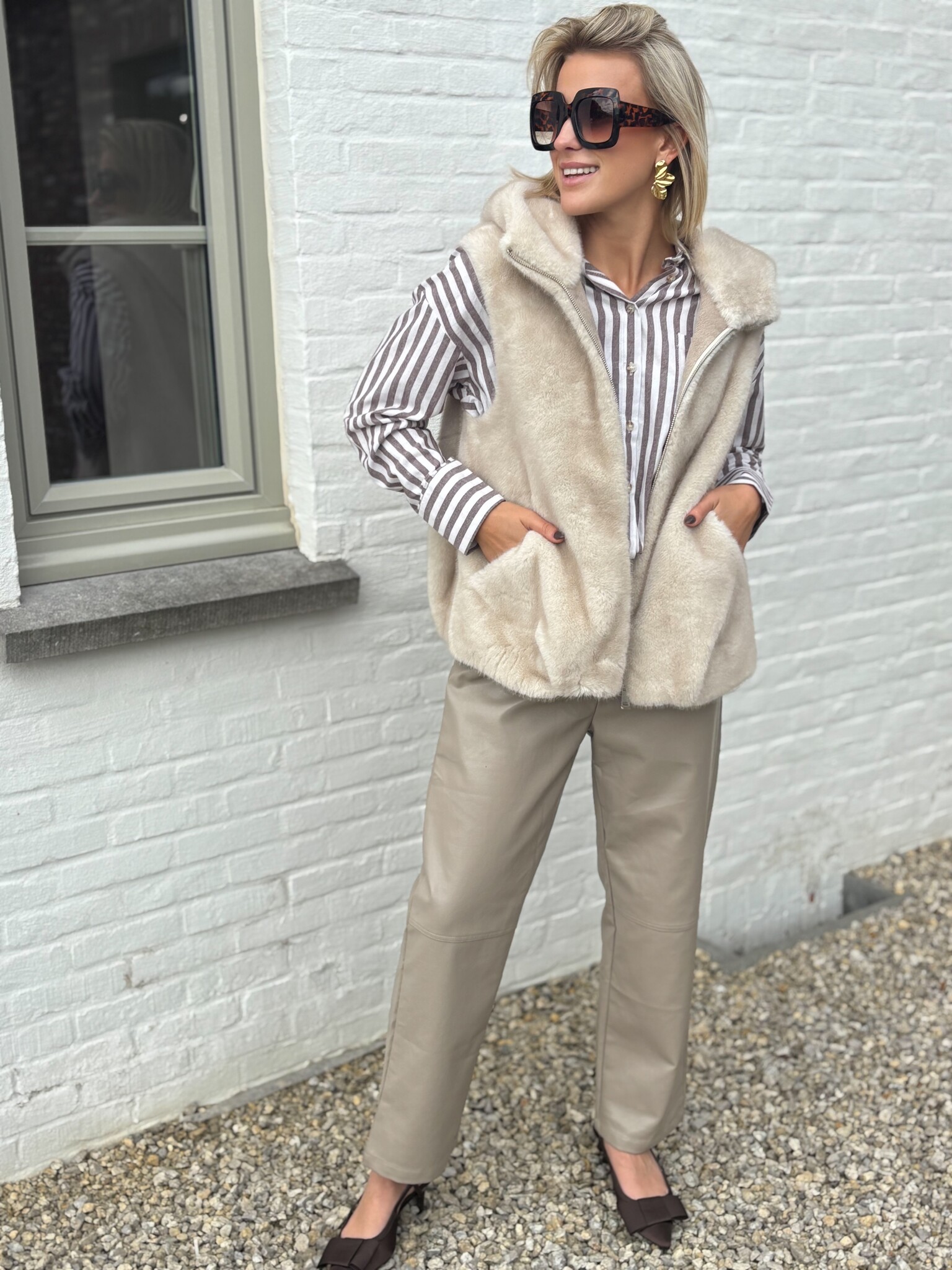 Aan verlanglijst toevoegenStep up your game Leather Pants Taupe €44,99 Size: *SMLToevoegen aan winkelwagenInloggen voor wishlistDirect betalenGratis verzending Vanaf €75,-BeschrijvingDeze broek in lederlook is een eyecatcher in deze collectie. Ze valt normaal van maat en is een cropped model.