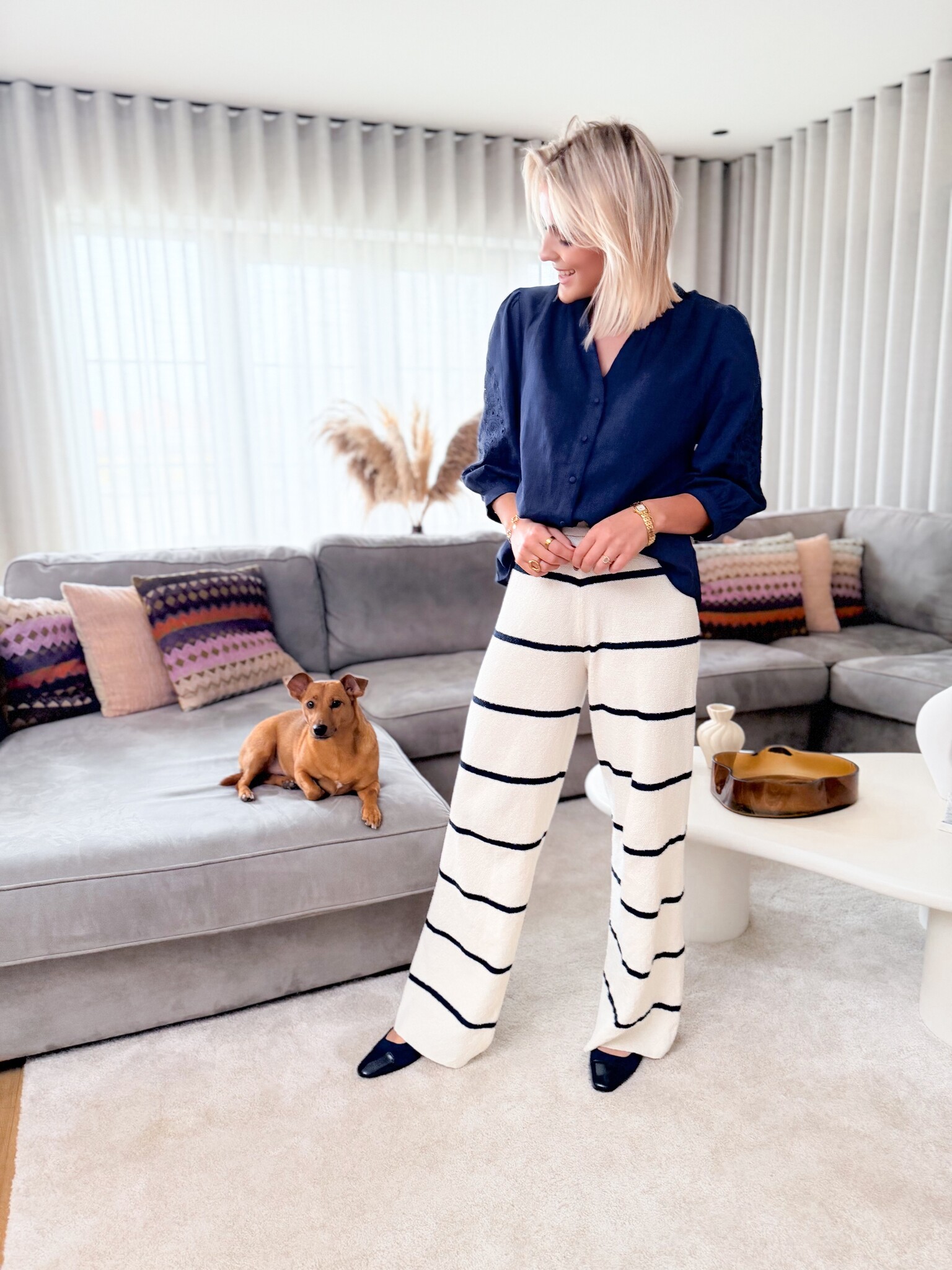 Aan verlanglijst toevoegenStride pants navy €49,99 Size: *XS/SM/LToevoegen aan winkelwagenInloggen voor wishlistDirect betalenGratis verzending Vanaf €75,-BeschrijvingLosvallende broek in een zachte bouclé stof. Valt soepel en geeft een relaxte maar stijlvolle look. Model is 1.62m en draagt maat XS/S. Heeft een ruime pasvorm met stretch.