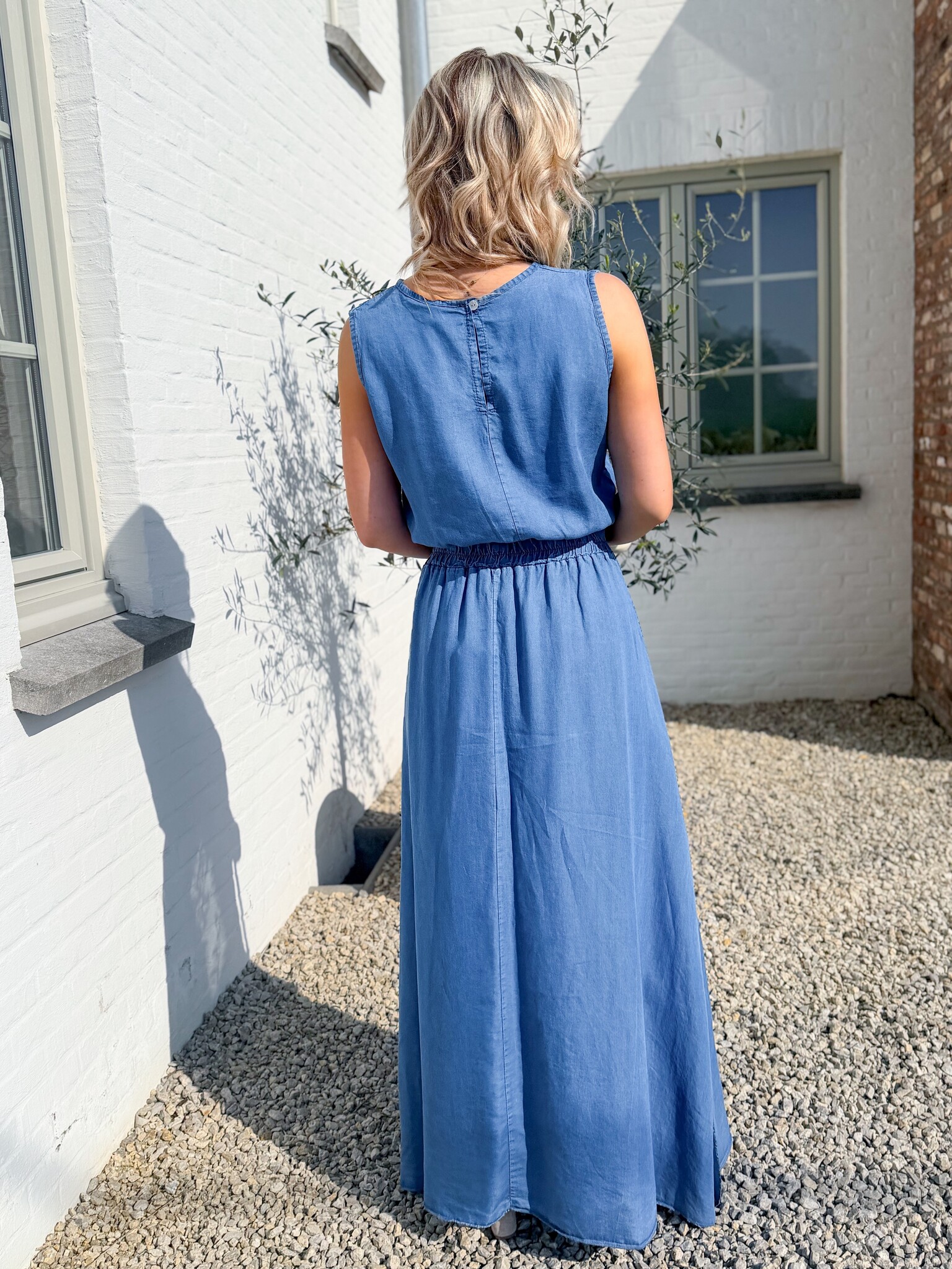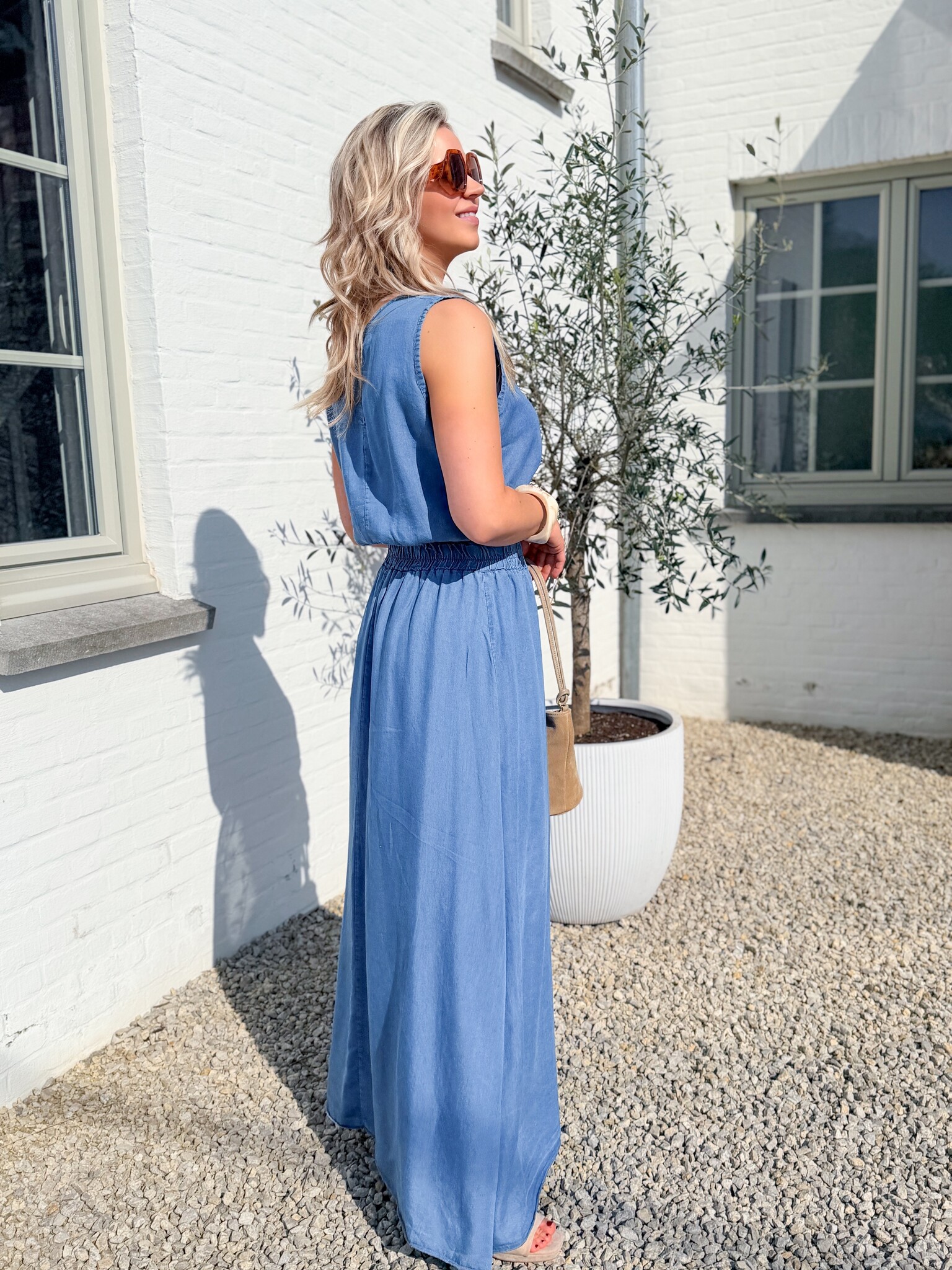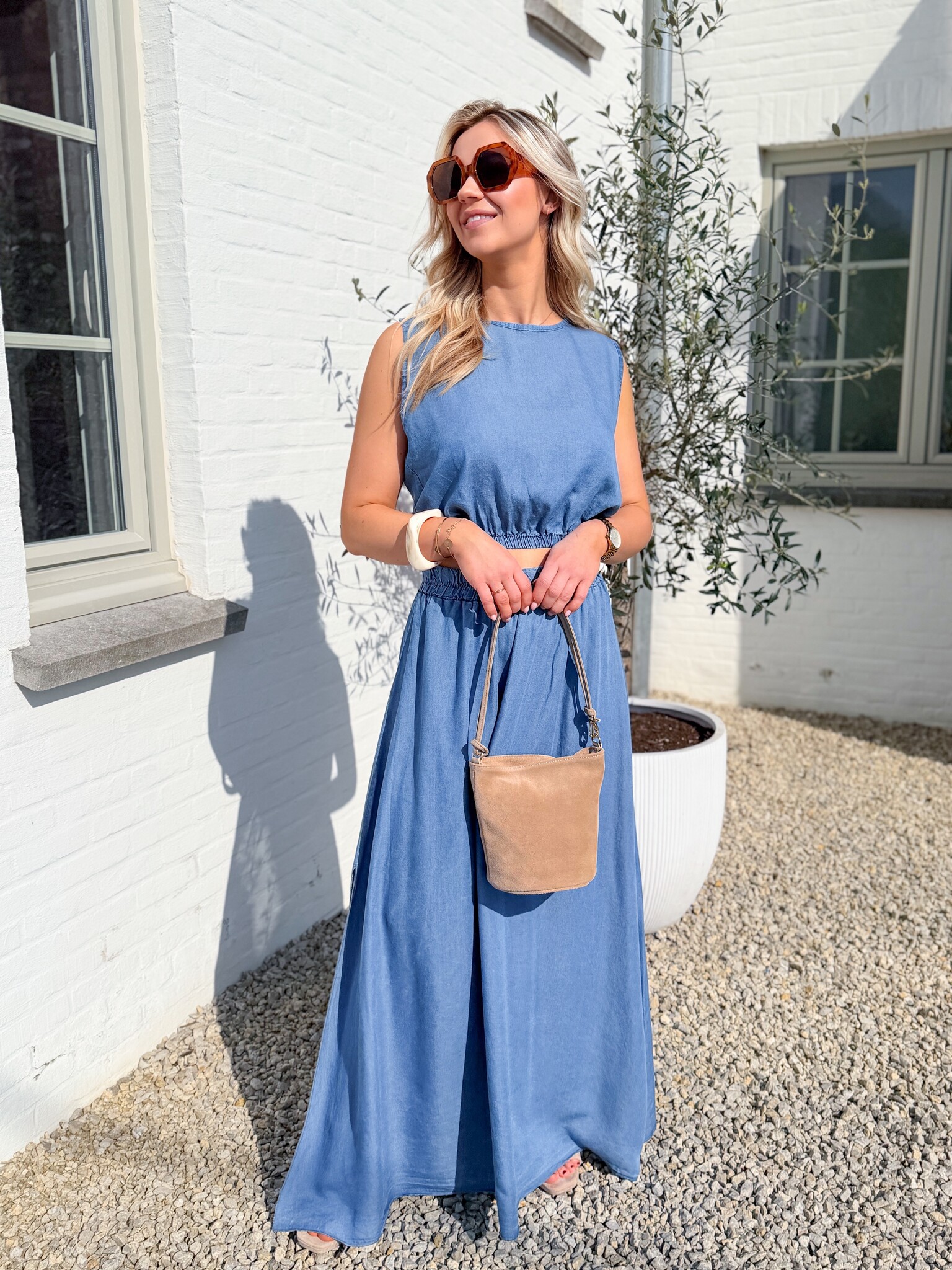 Aan verlanglijst toevoegenSunny jeans set dark €59,99 Toevoegen aan winkelwagenInloggen voor wishlistDirect betalenBeschrijvingTweedelig setje met een stijlvolle denim look, bestaande uit een top en een lange rok. De set valt mooi en sluit comfortabel aan tot maat L. Beschikbaar in één maat. Het model is 1m64 en draagt maat S.
