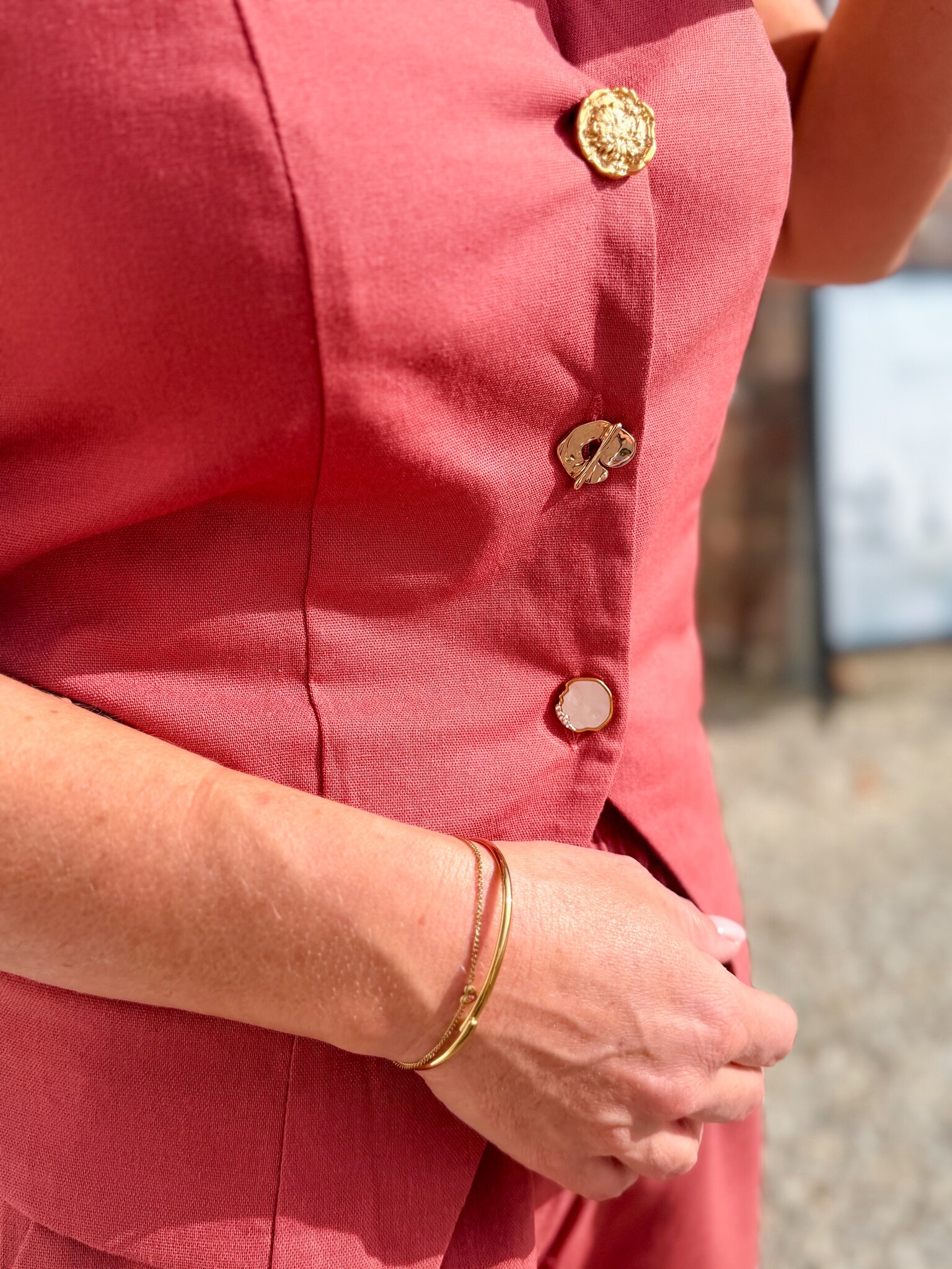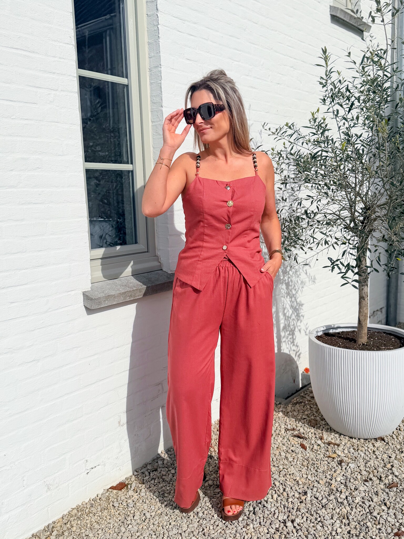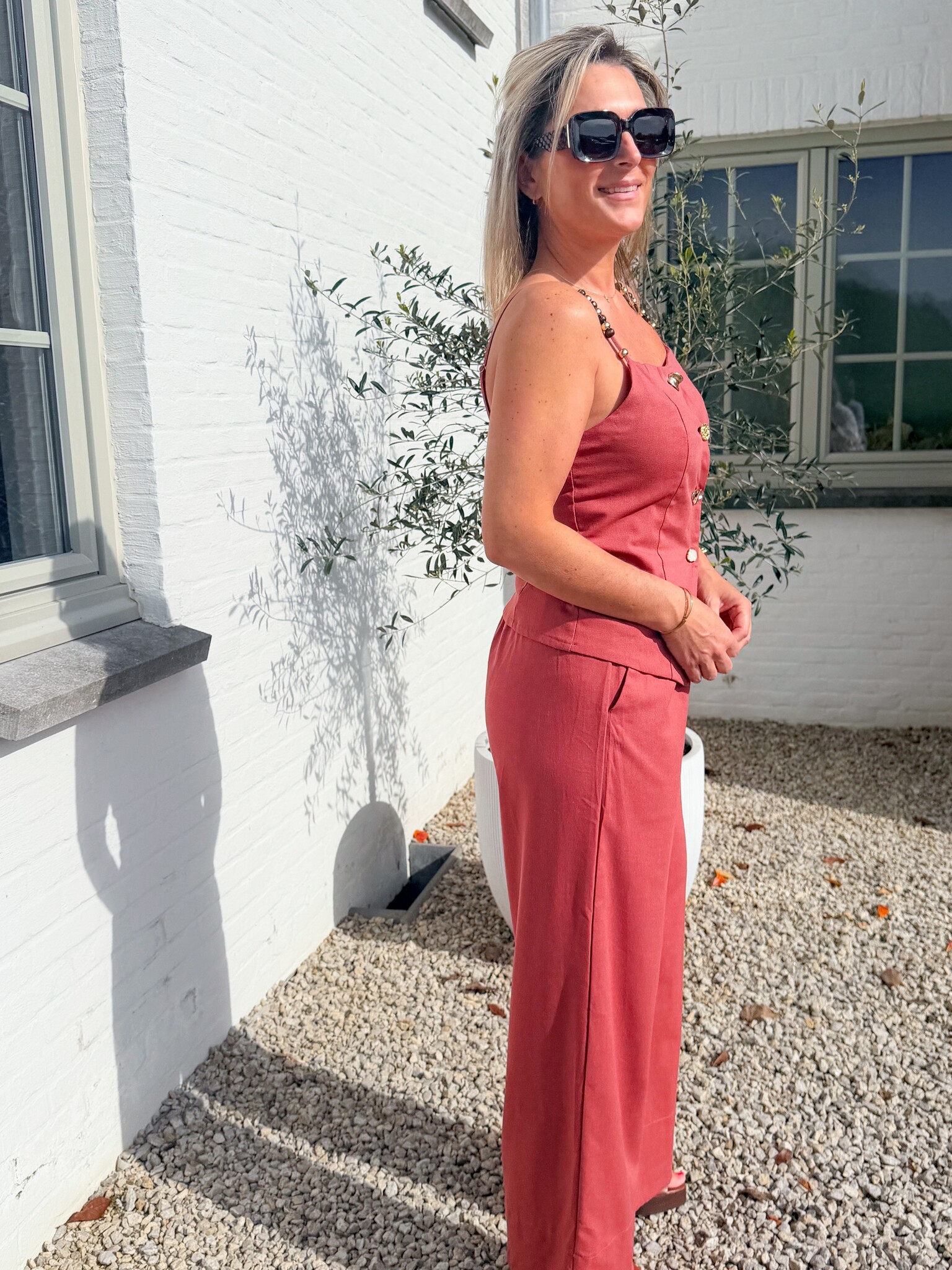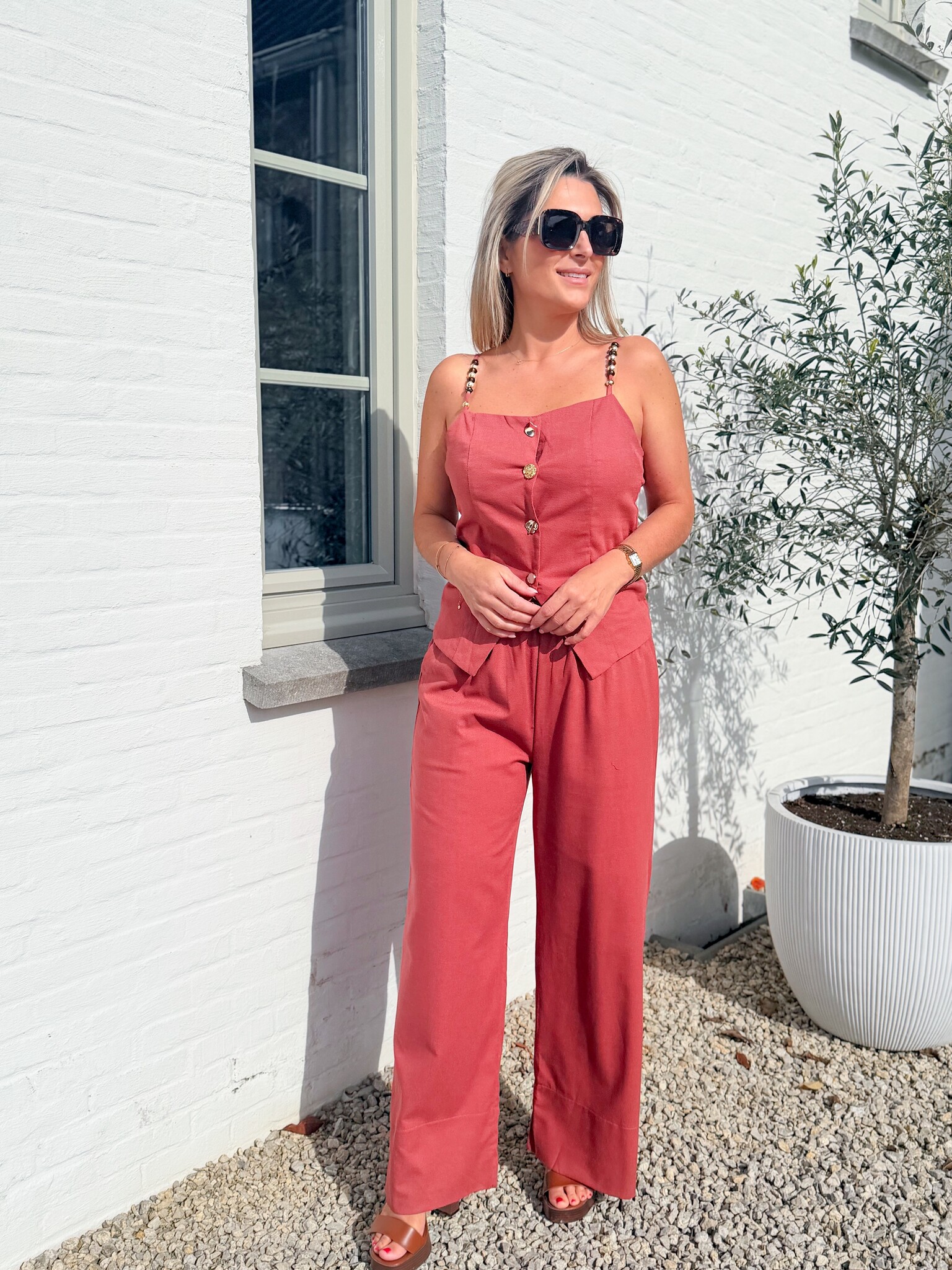 Aan verlanglijst toevoegenTerra set €54,99 Size: *SMLToevoegen aan winkelwagenInloggen voor wishlistDirect betalenBeschrijvingLinnen set met fijne spaghetti bandjes, subtiele pareldetails voor een extra touch en elegante gouden knopen. Licht, luchtig en stijlvol. Perfect voor een chique, zomerse look. Valt op maat.