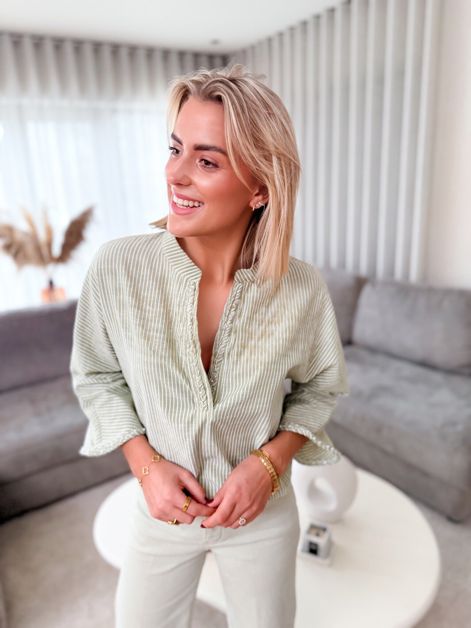 Aan verlanglijst toevoegenThe open line green €39,99 Size: *SMMLToevoegen aan winkelwagenInloggen voor wishlistDirect betalenGratis verzending Vanaf €75,-BeschrijvingLuchtig hemdje met een mooie gevlochten V-hals, afgewerkt met fijne parels. Een verfijnd detail dat meteen opvalt en je outfit een elegante, vrouwelijke touch geeft. Licht en comfortabel om te dragen.